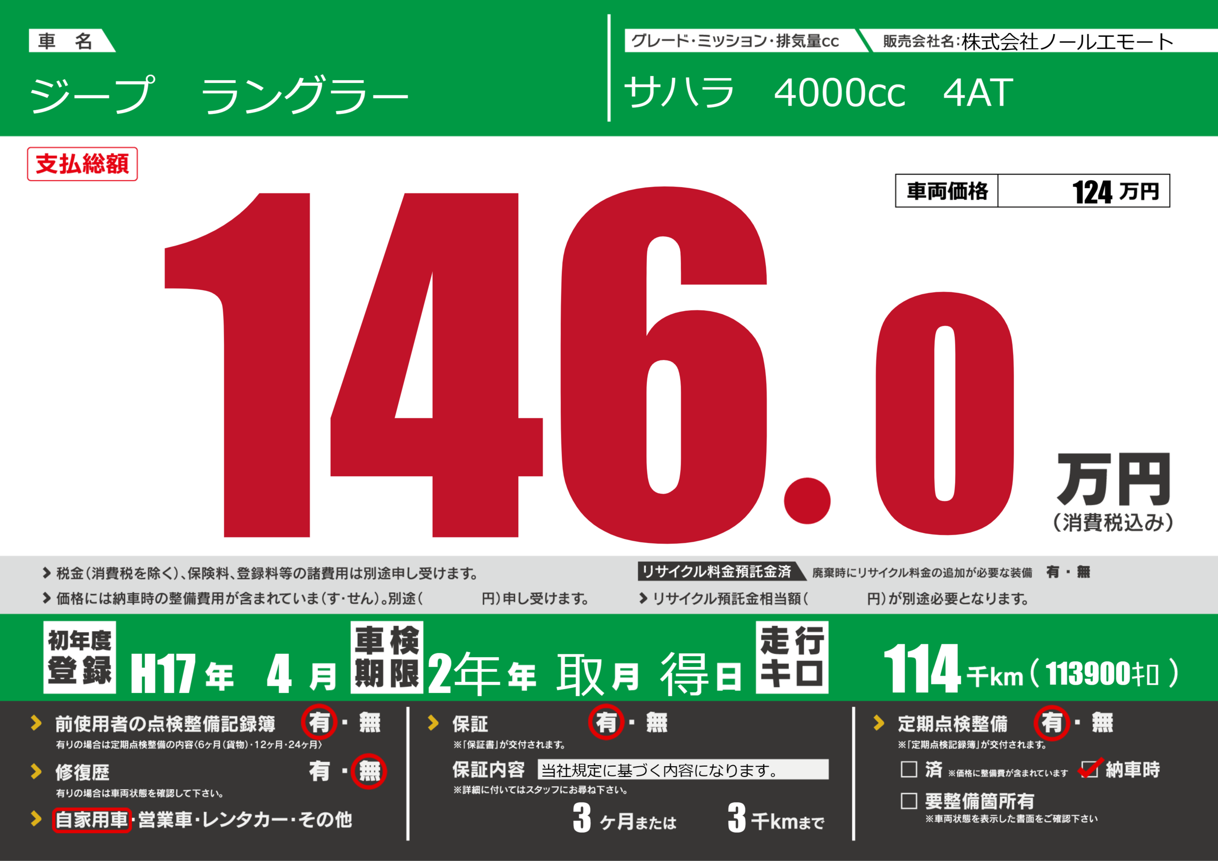 | 走行キロ | 11.4万km | 初年度登録 | H17年4月 |