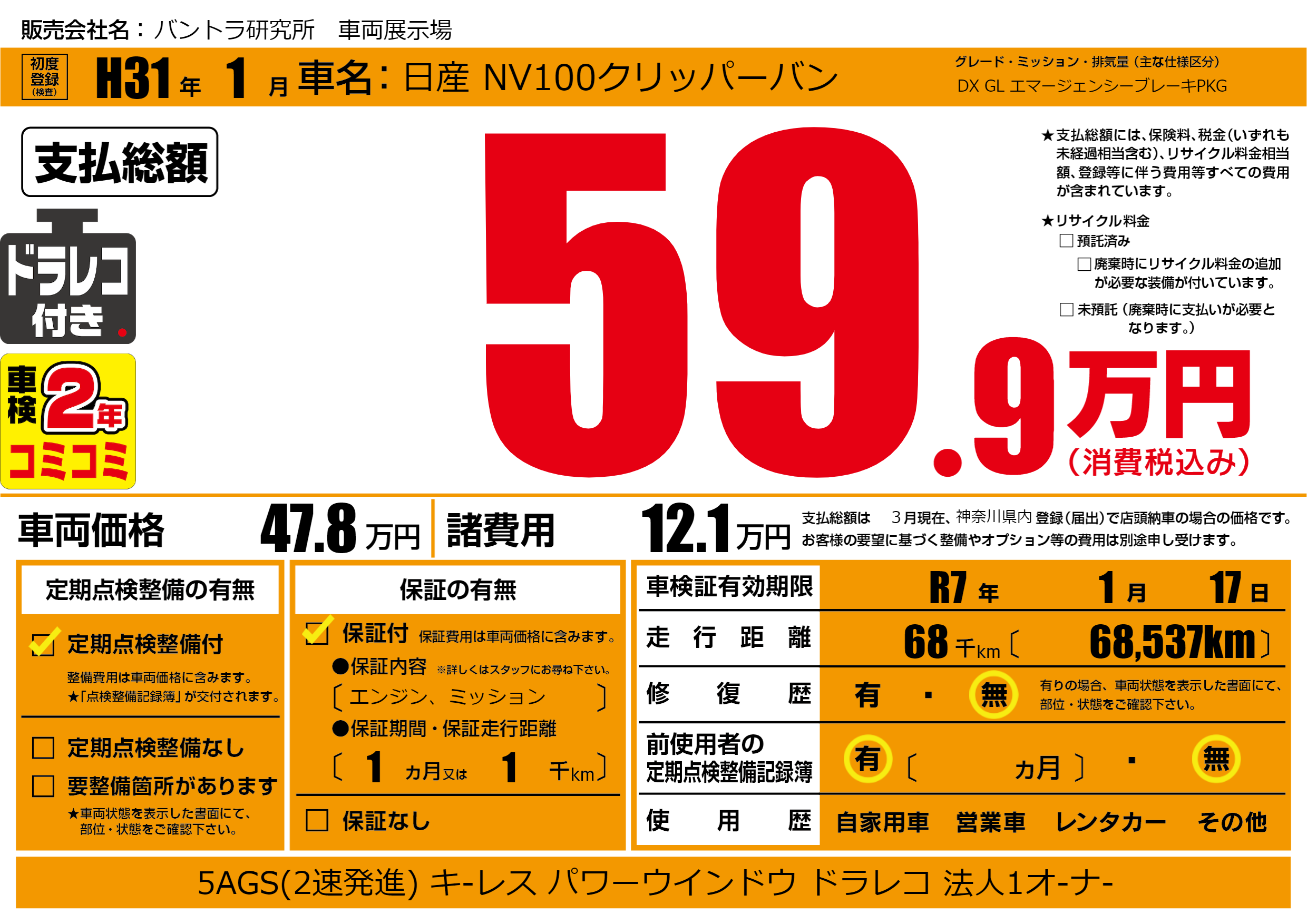 | 車名 | 日産 NV100クリッパーバン | グレード ミッション 排気量 |