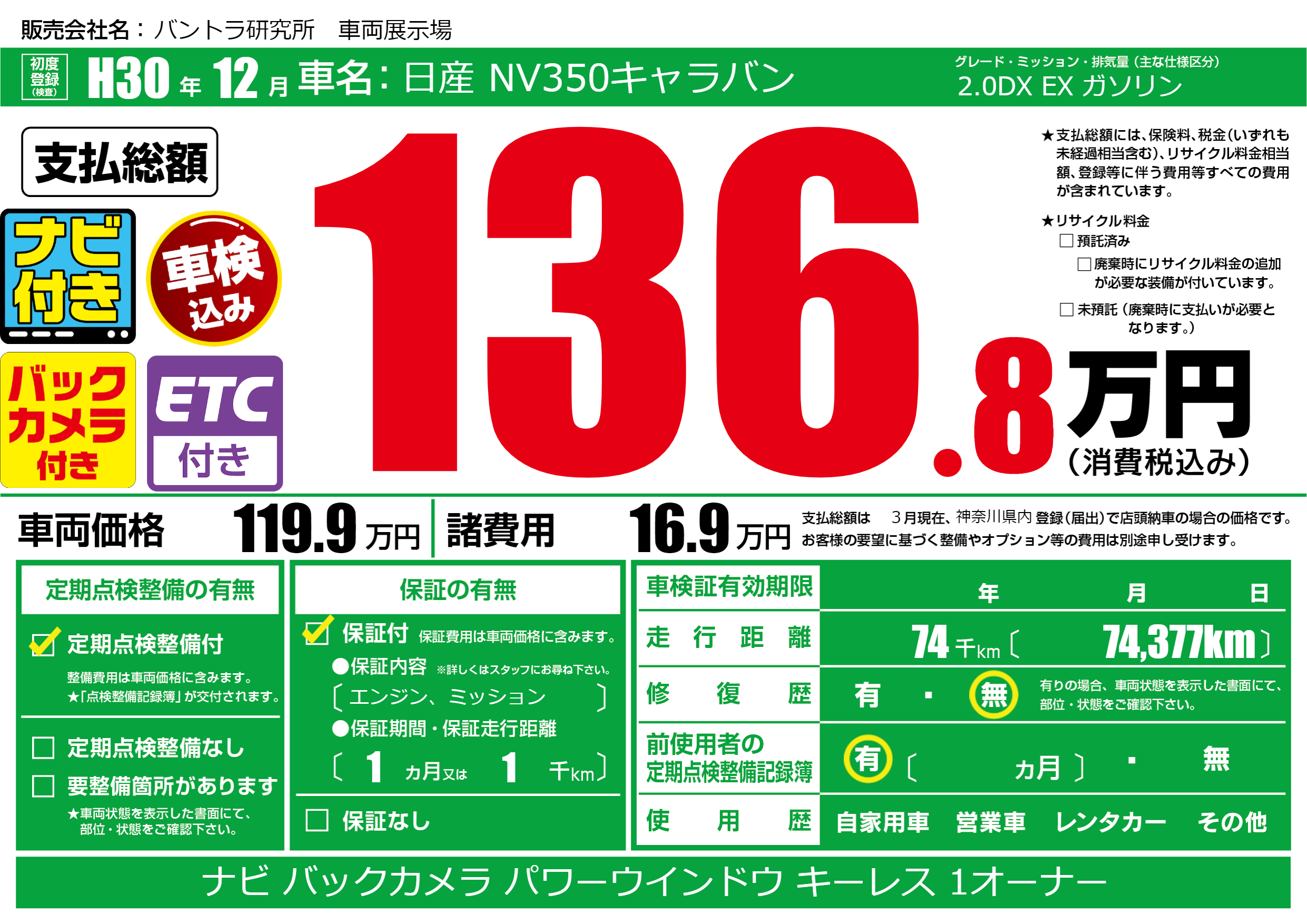 | 走行キロ | 7.4万km | 初年度登録 | H30年12月 |