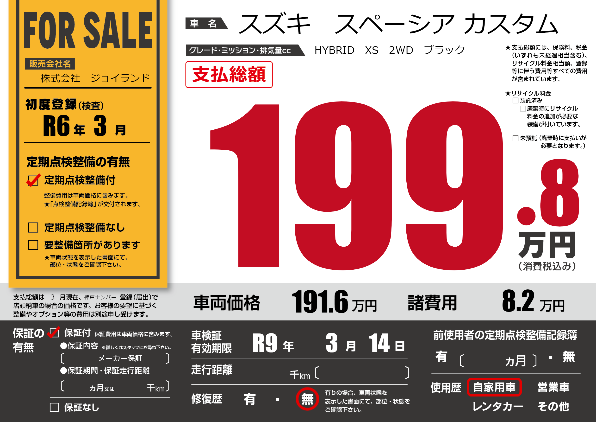 | 車名 | スズキ スペーシア カスタム | グレード ミッション 排気量 |