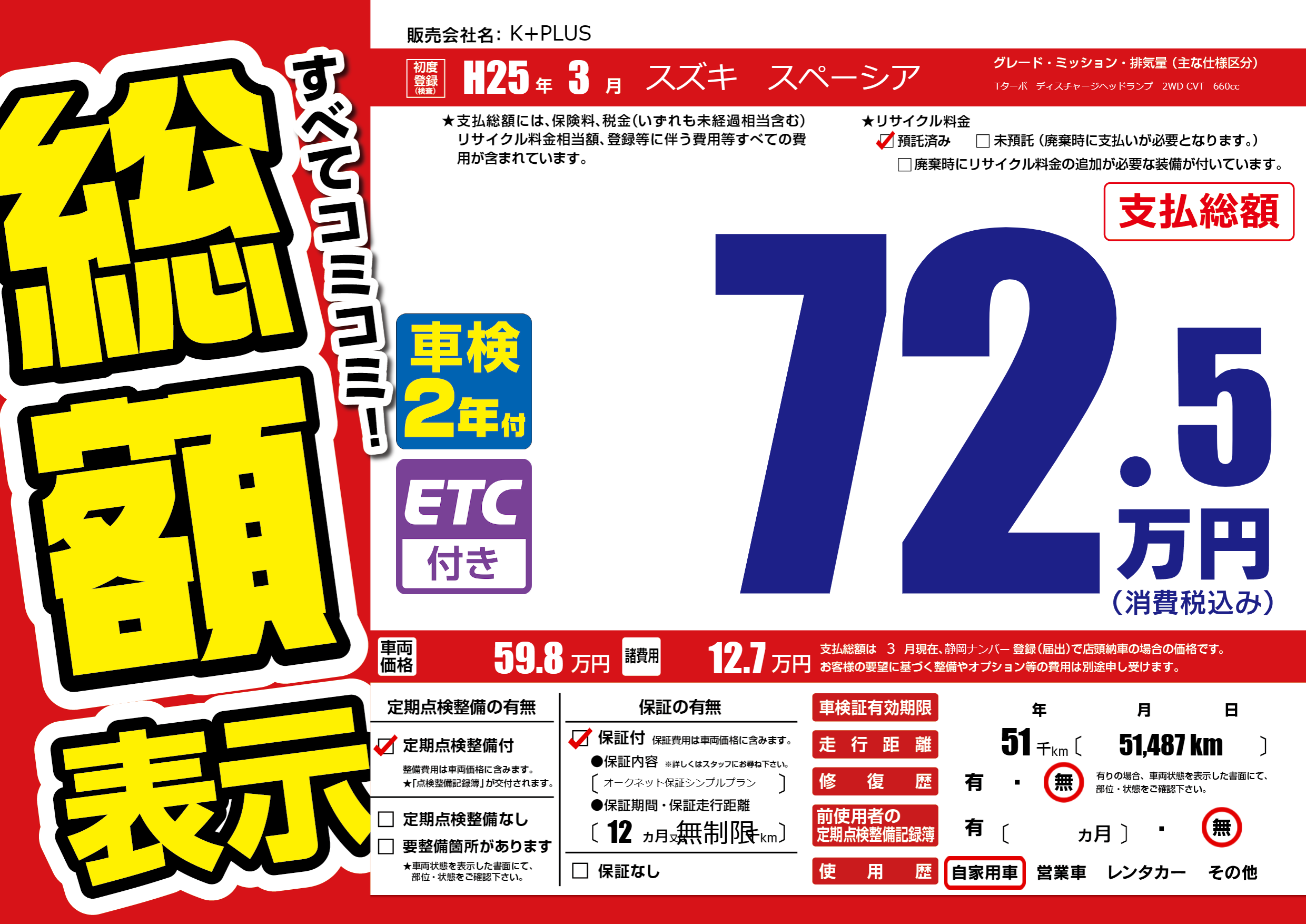 | 走行キロ | 5.1万km | 初年度登録 | H25年3月 |