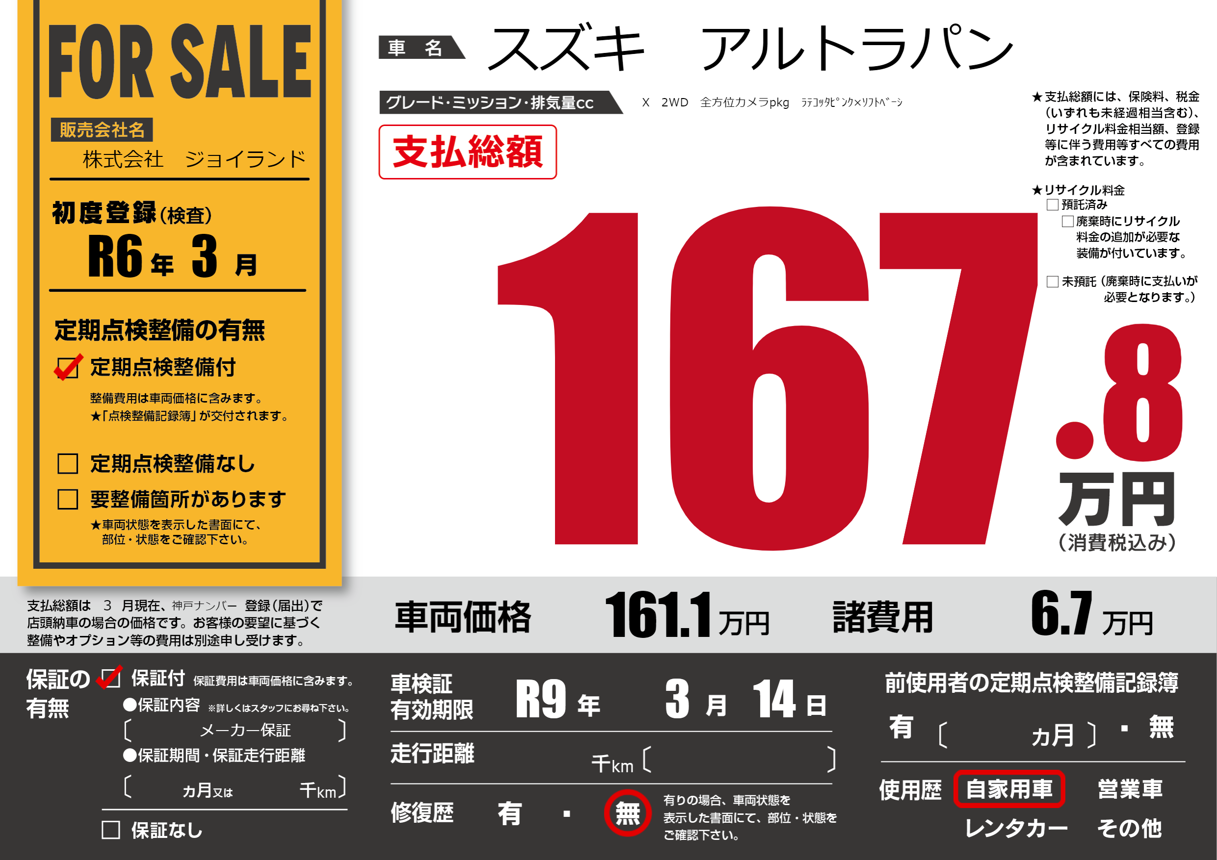 保証付き 保証内容( メーカー保証) ---ヶ月または()千kmまで |