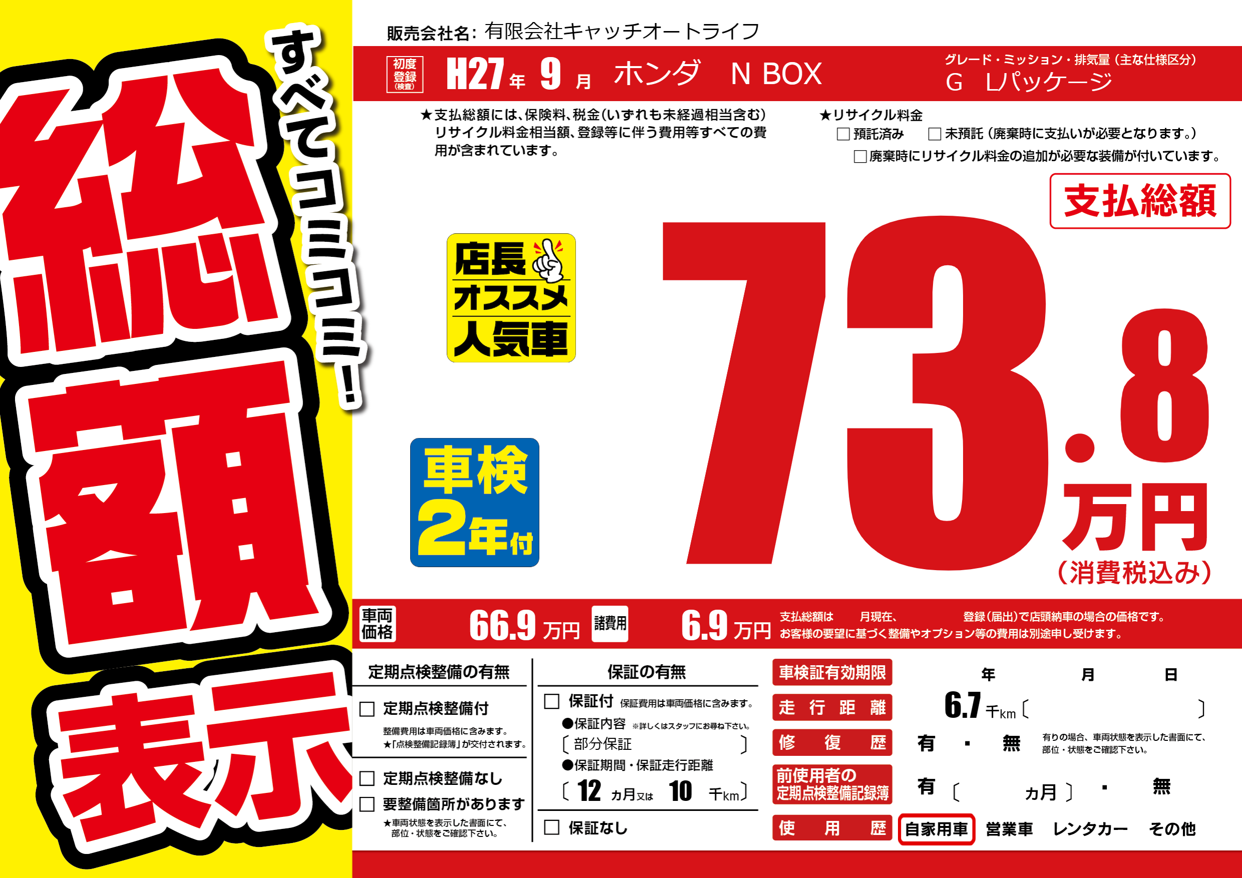 | 車名 | ホンダ N BOX | グレード ミッション 排気量 |