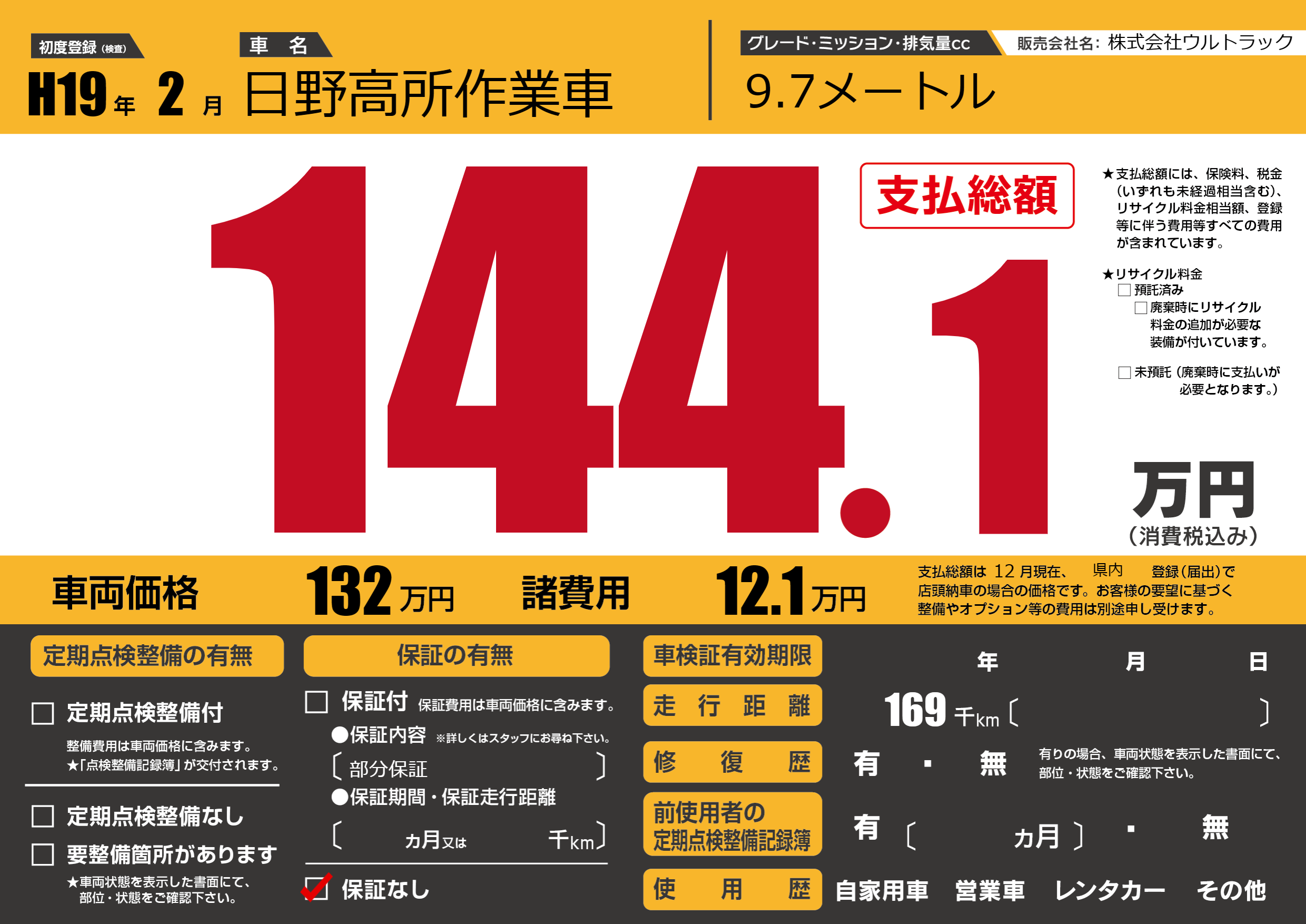 | 車名 | 日野高所作業車 | グレード ミッション 排気量 |