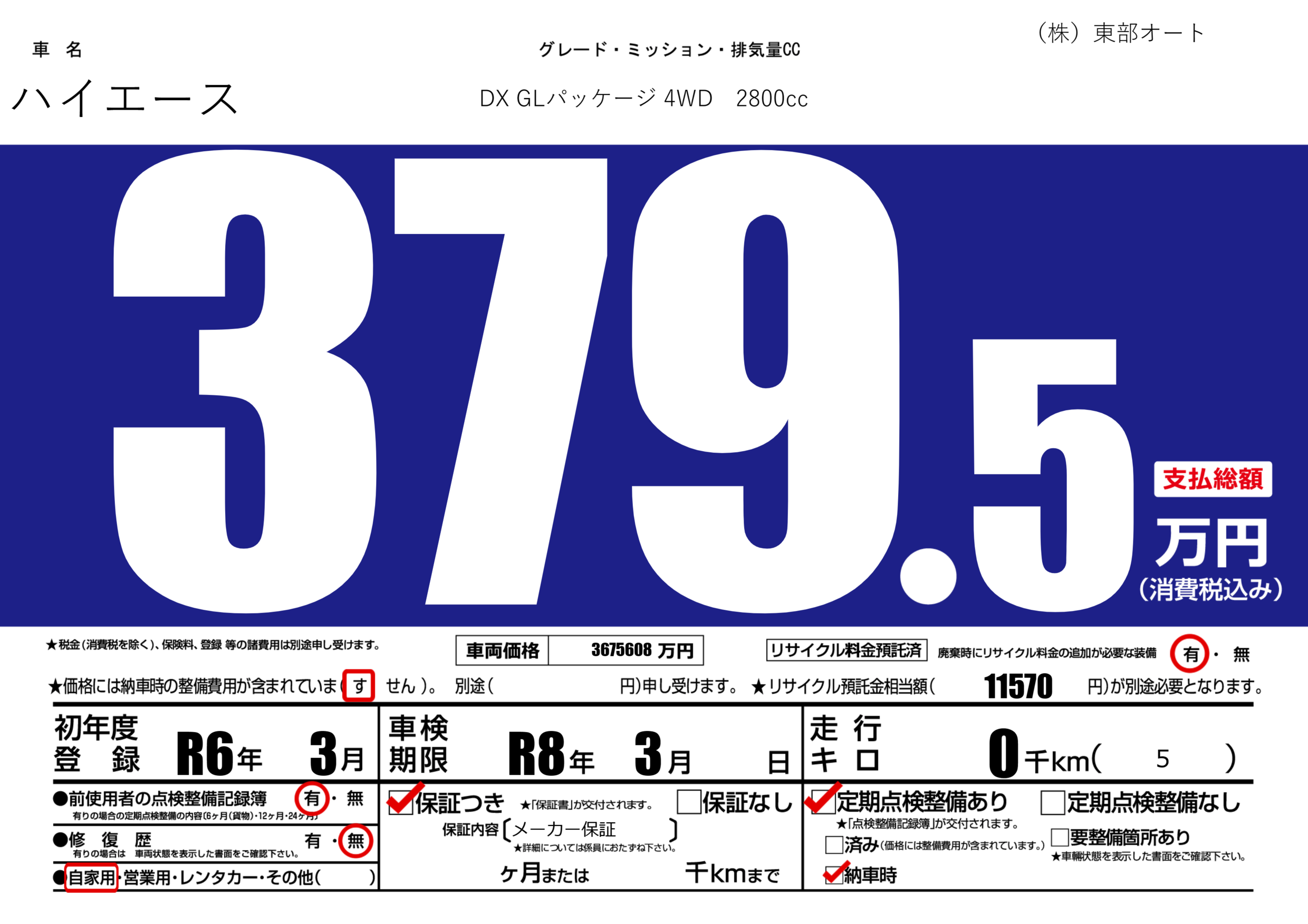 | 車名 | ハイエース | グレード ミッション 排気量 |