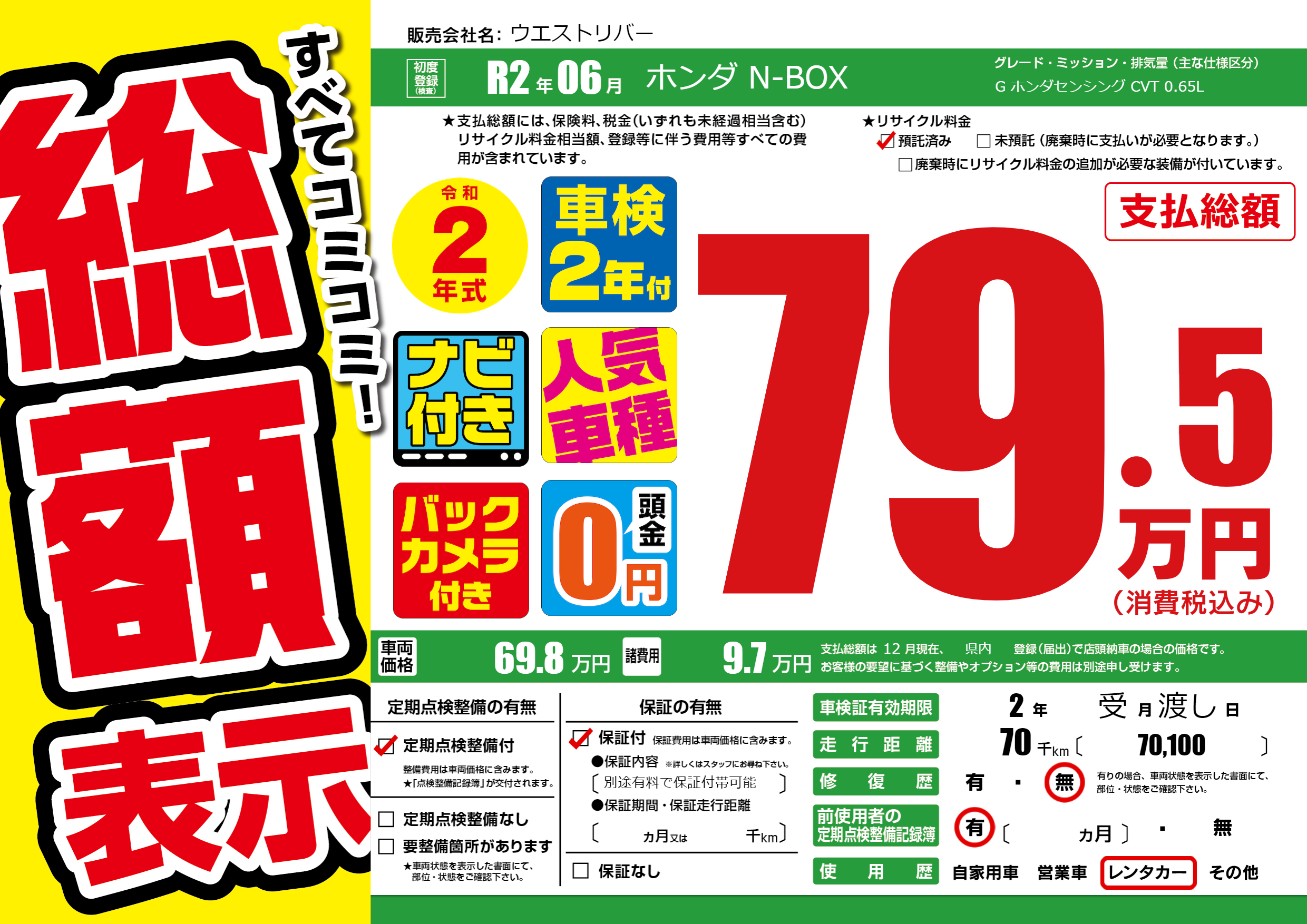 | 走行キロ | 7万km | 初年度登録 | R2年06月 |