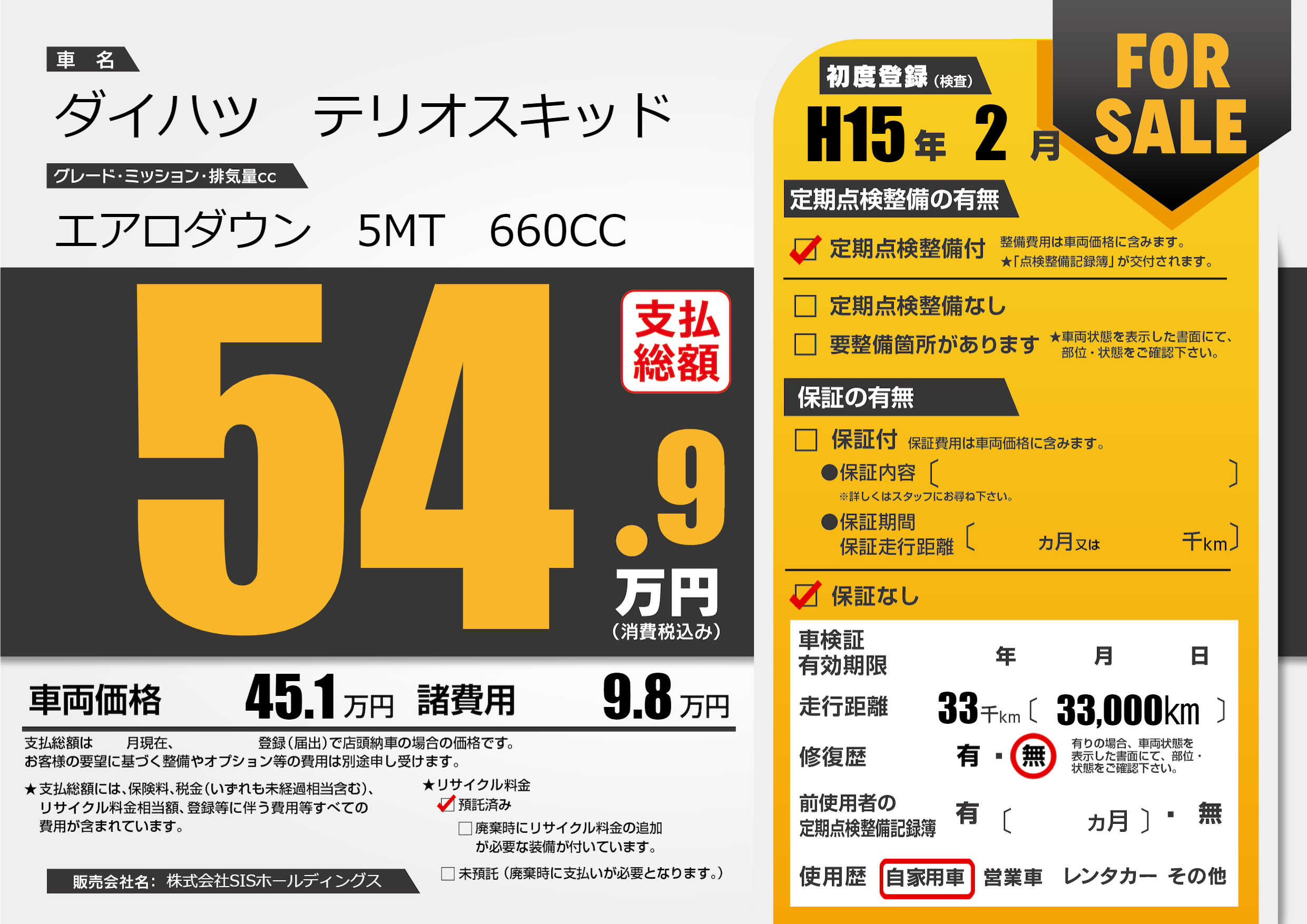 | 車名 | ダイハツ テリオスキッド | グレード ミッション 排気量 |