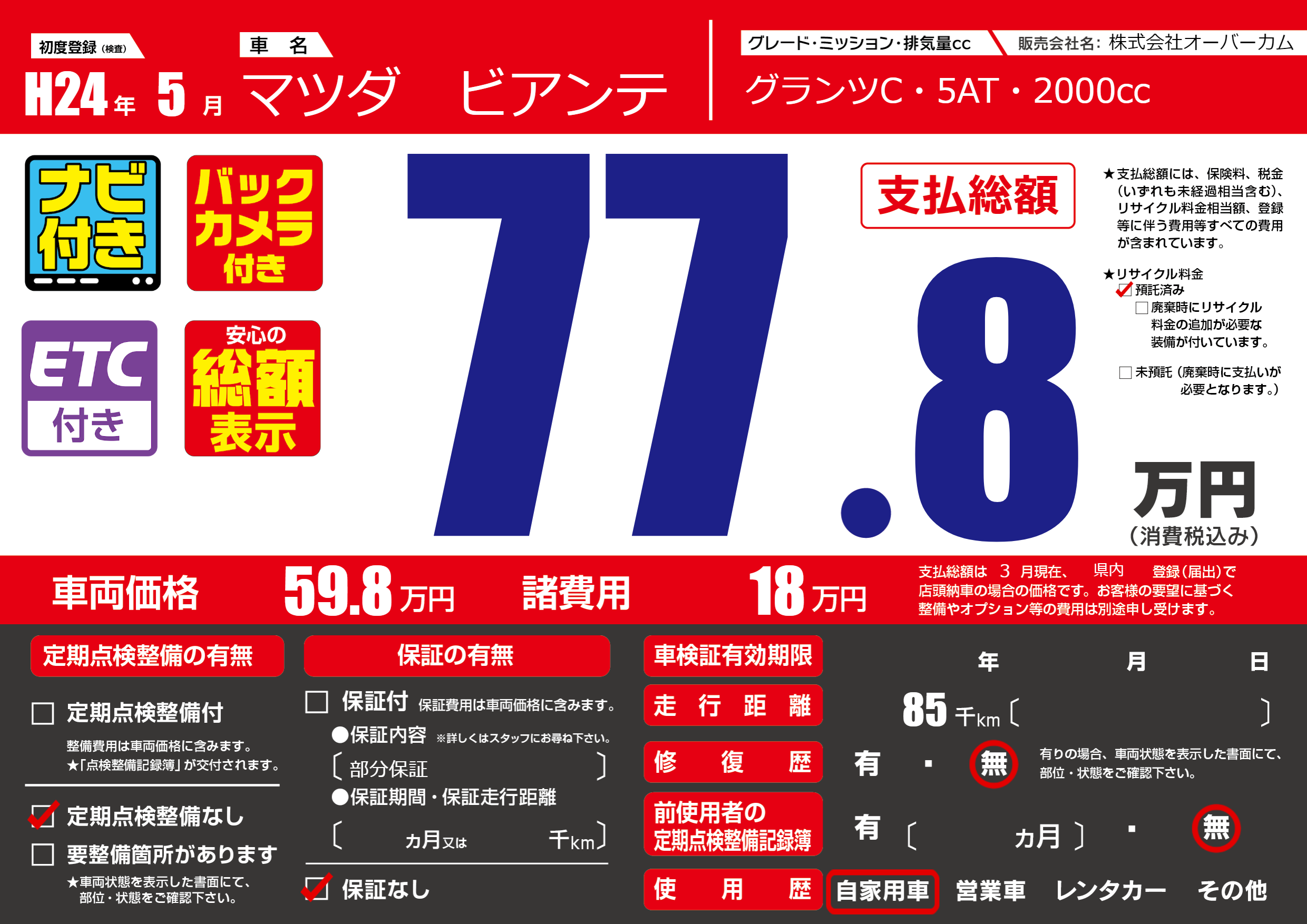 | 車検制限 | - 年 - 月 - 日 | ||