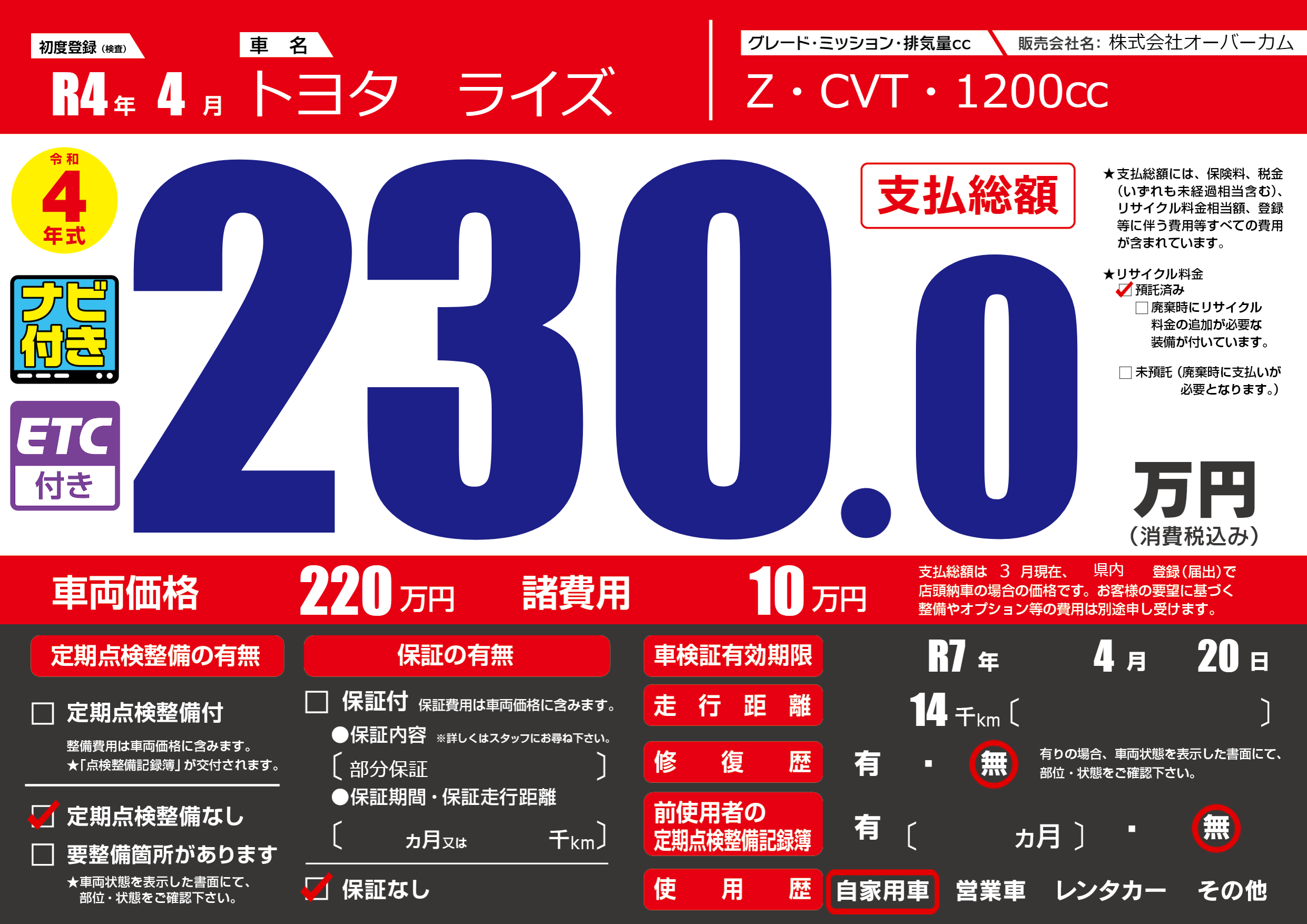 | 車名 | トヨタ ライズ | グレード ミッション 排気量 |