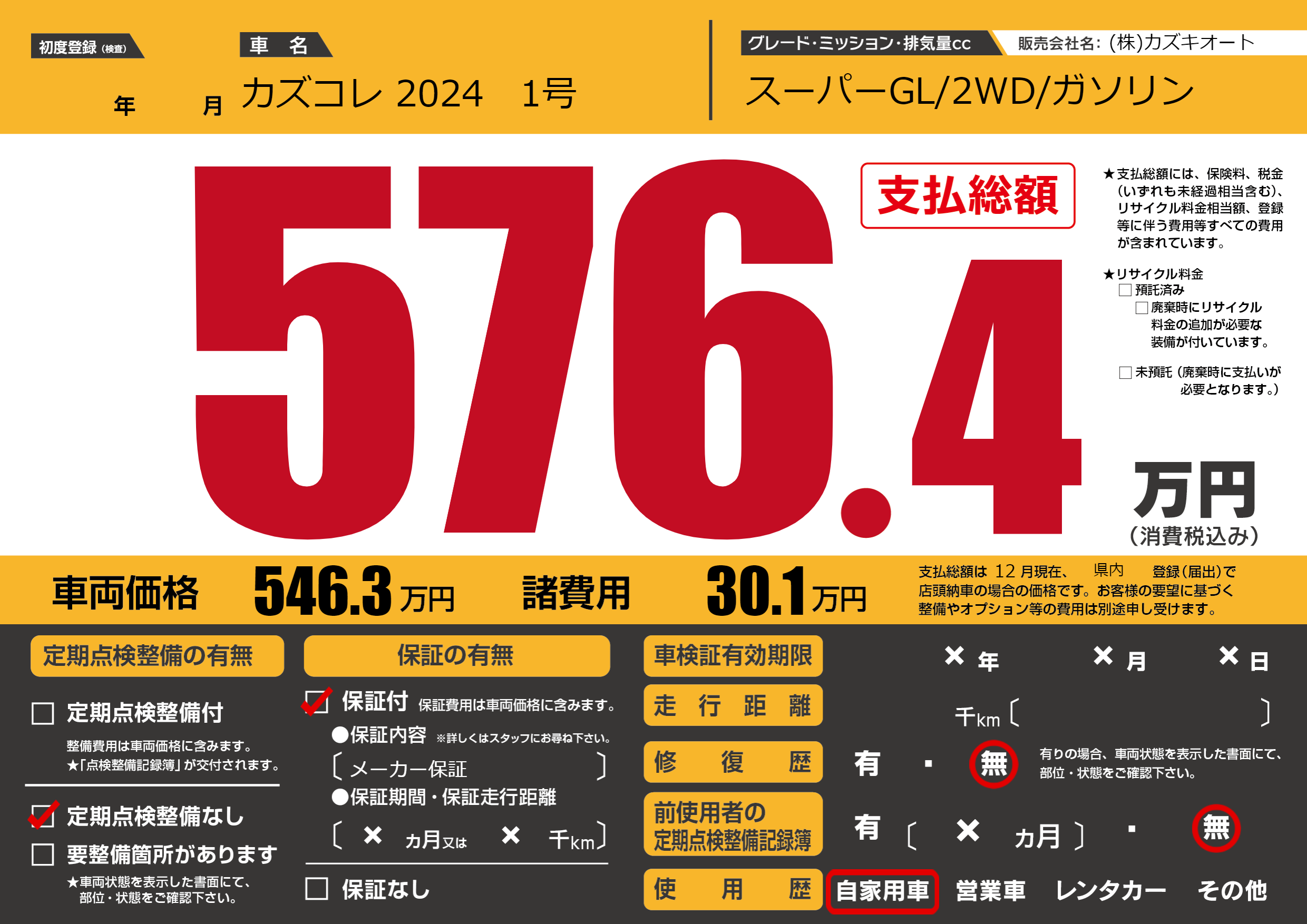 | 車名 | カズコレ 2024 1号 | グレード ミッション 排気量 |