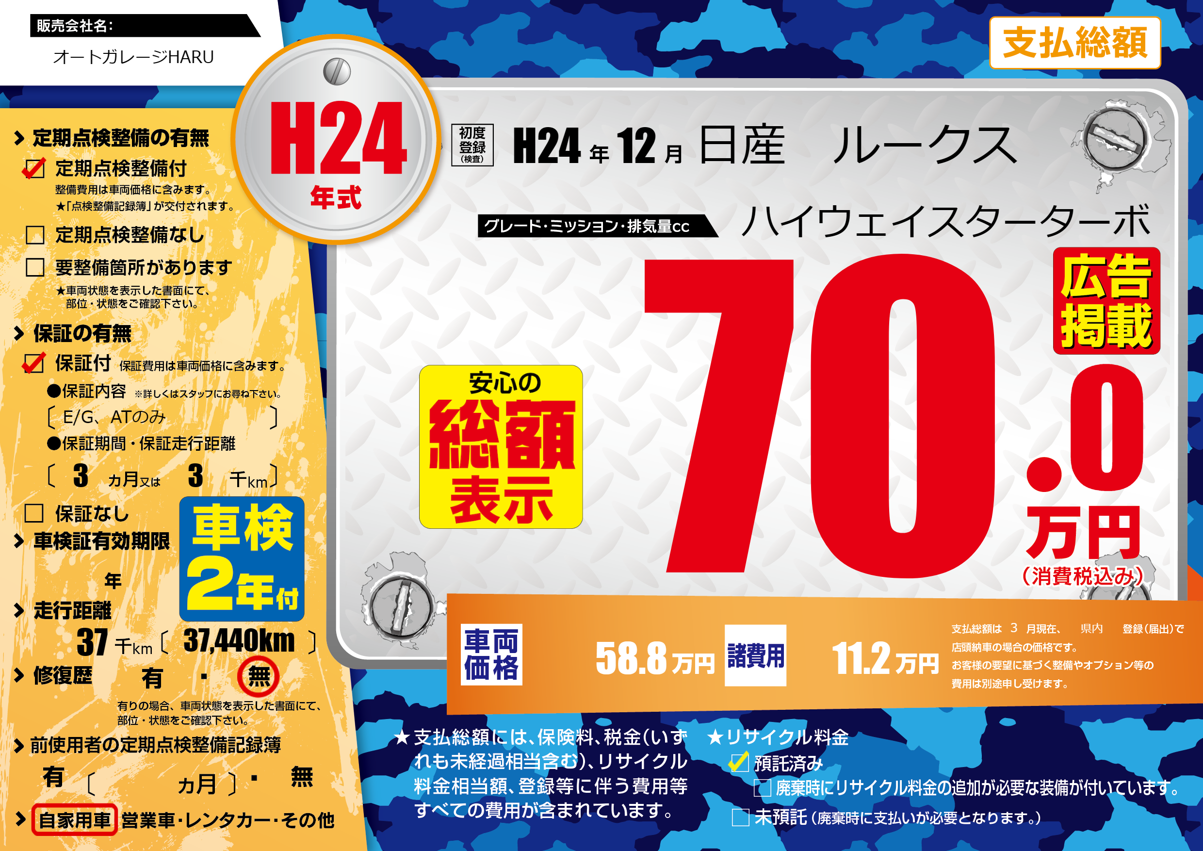 | 走行キロ | 3.7万km | 初年度登録 | H24年12月 |