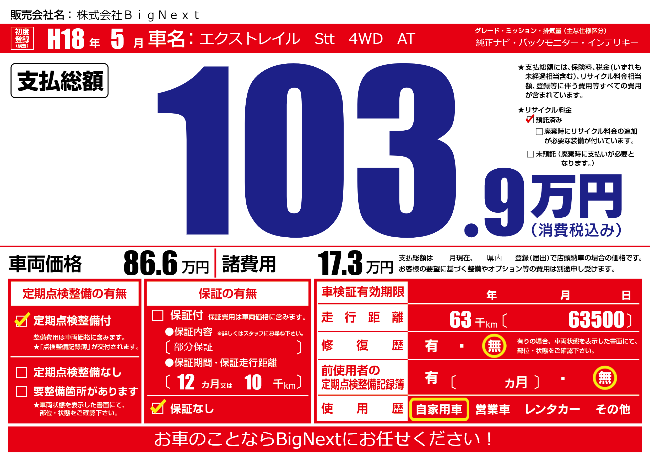 | 車名 | エクストレイル Stt 4WD AT | グレード ミッション 排気量 |