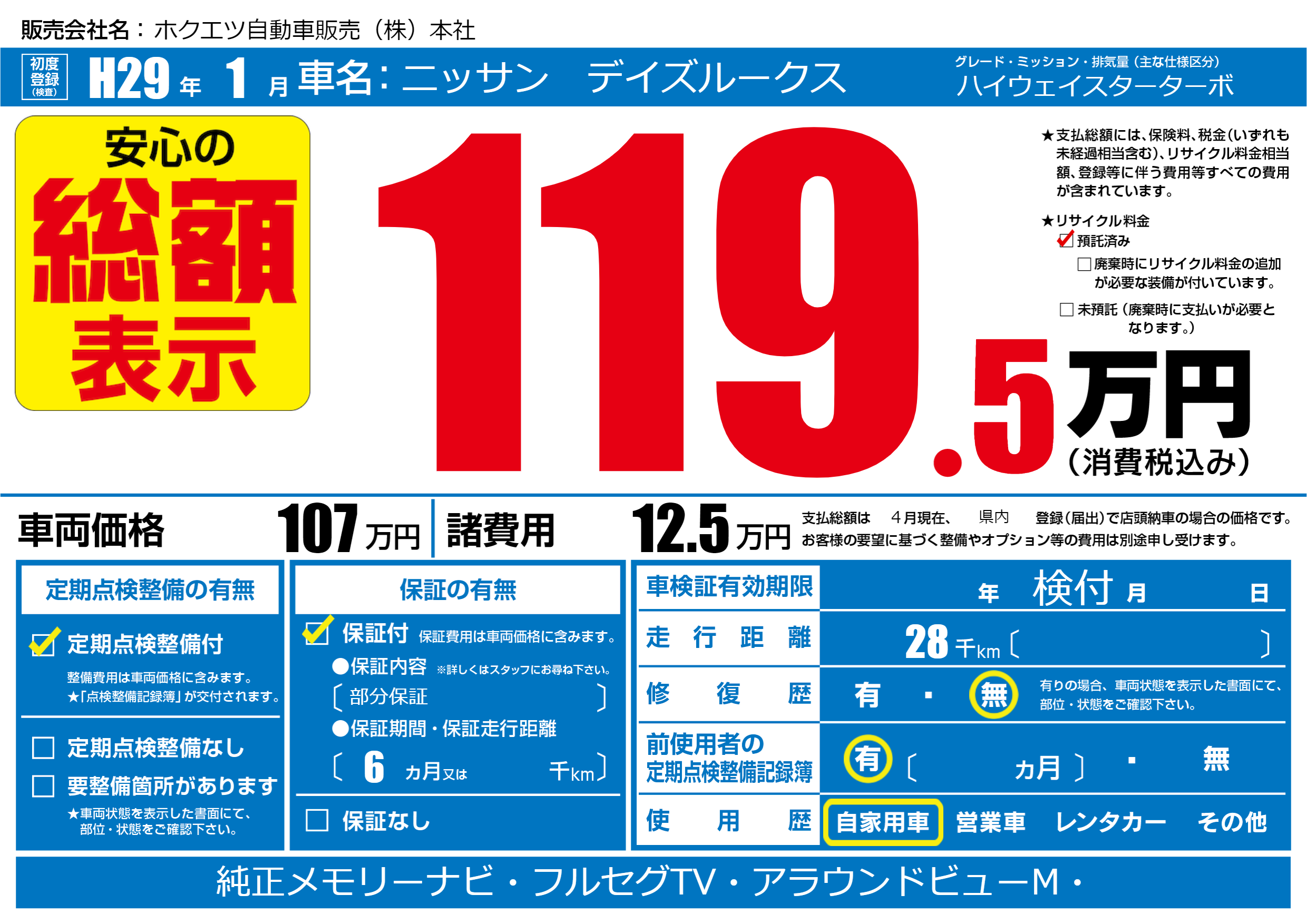 | 車名 | ニッサン デイズルークス | グレード ミッション 排気量 |