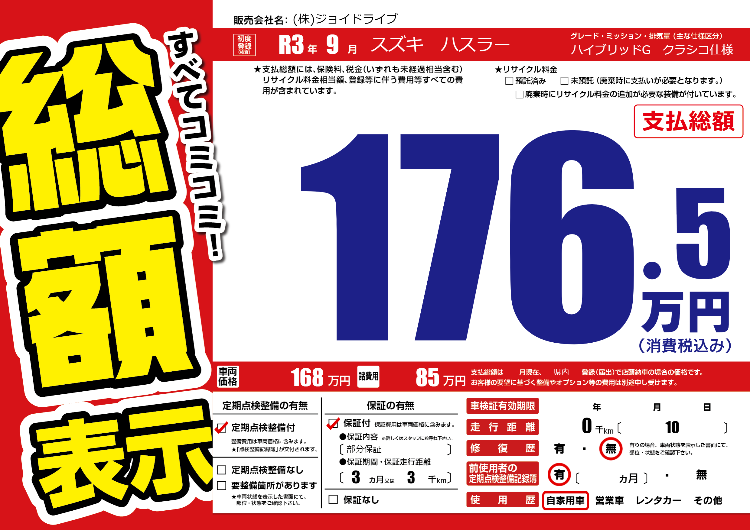 | 車名 | スズキ ハスラー | グレード ミッション 排気量 |