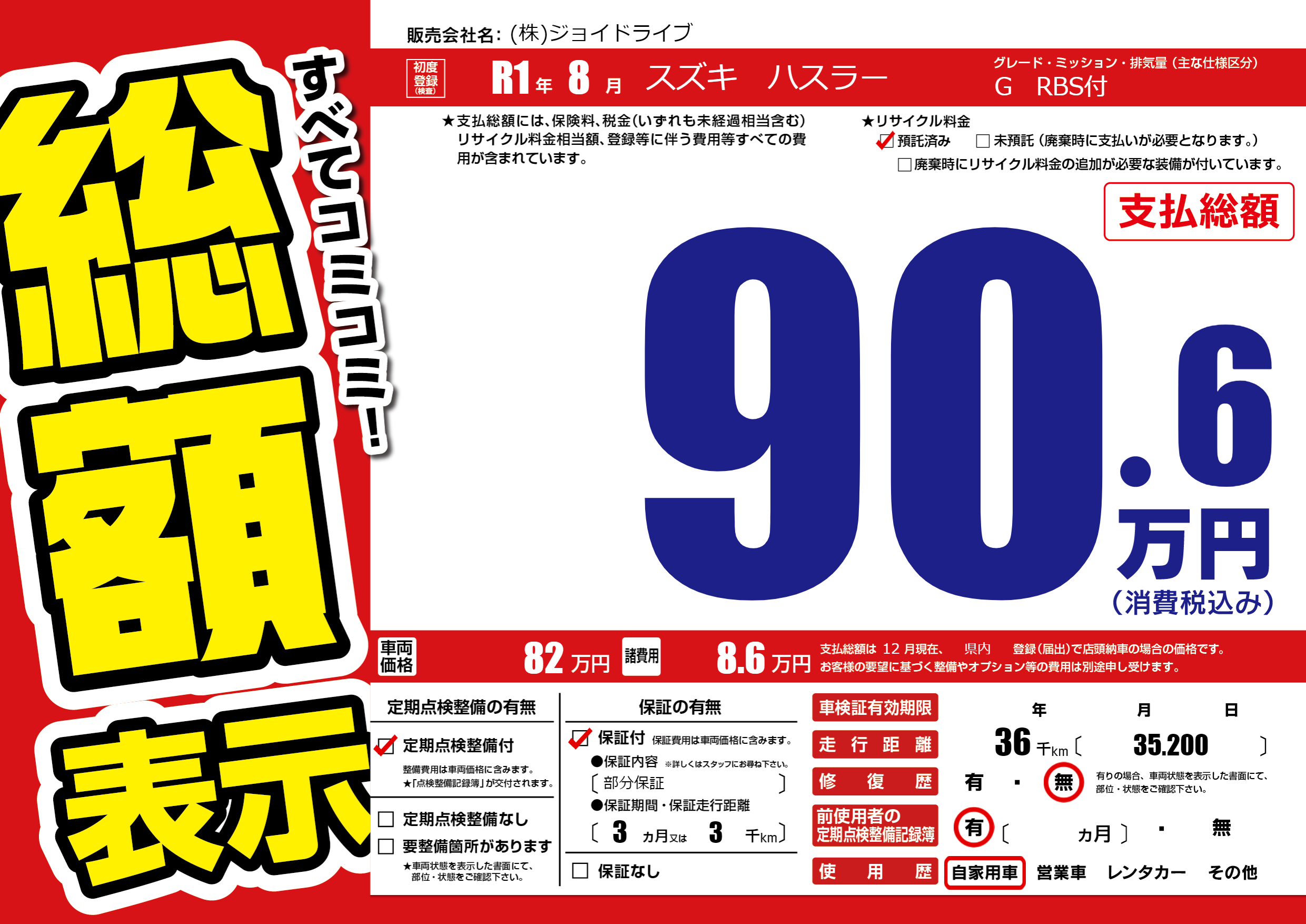 | 車名 | スズキ ハスラー | グレード ミッション 排気量 |