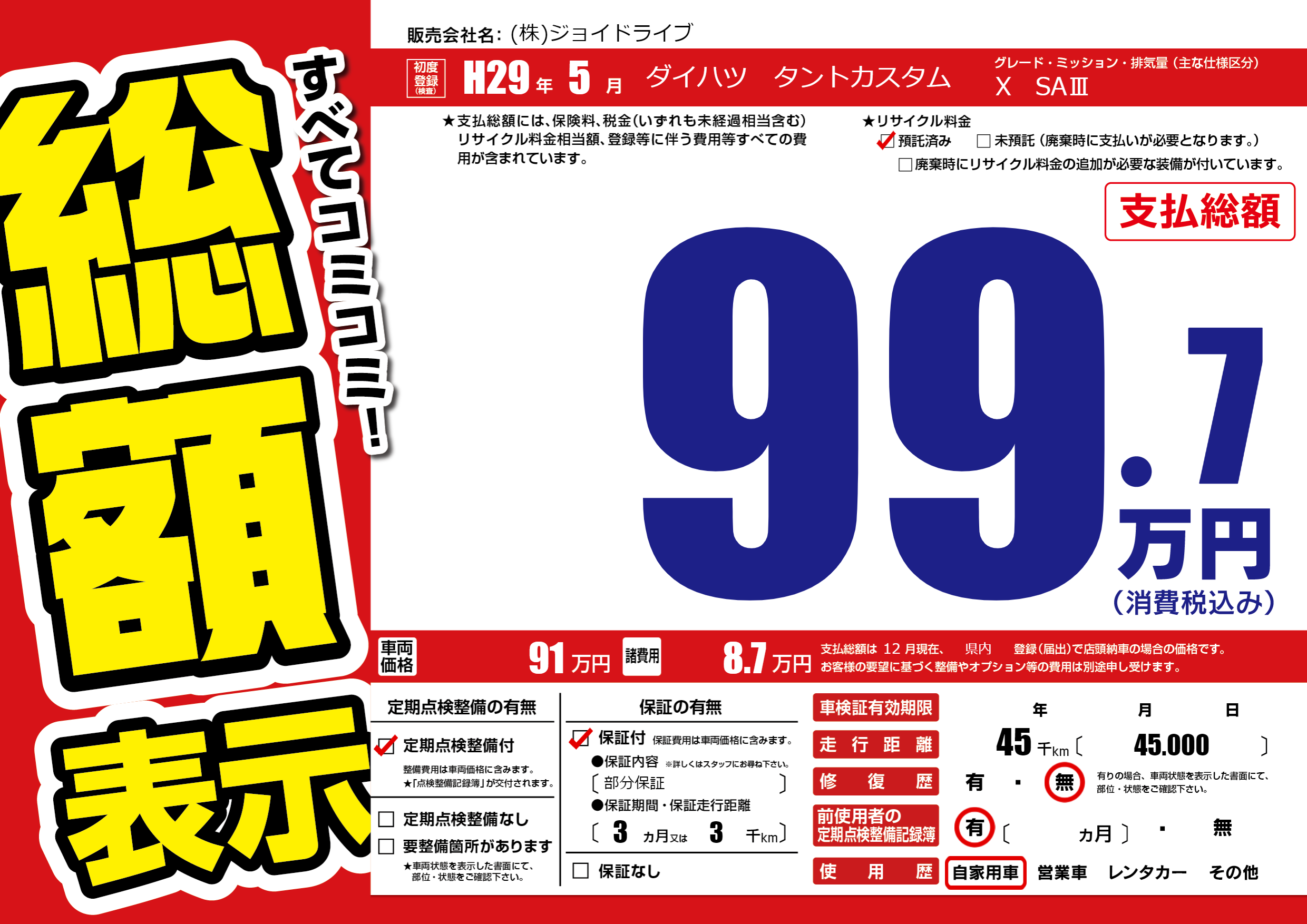 | 走行キロ | 4.5万km | 初年度登録 | H29年5月 |