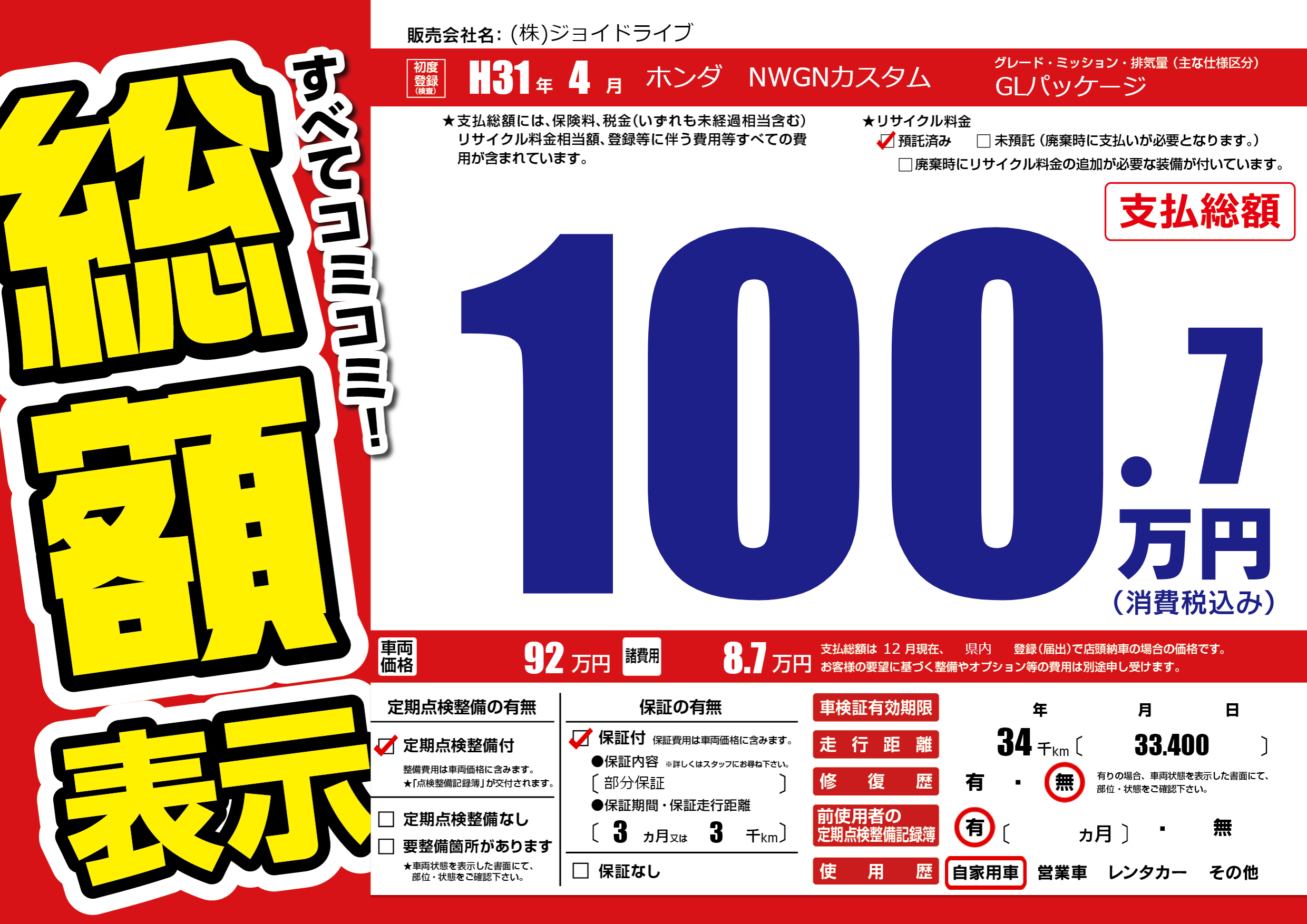 | 走行キロ | 3.4万km | 初年度登録 | H31年4月 |