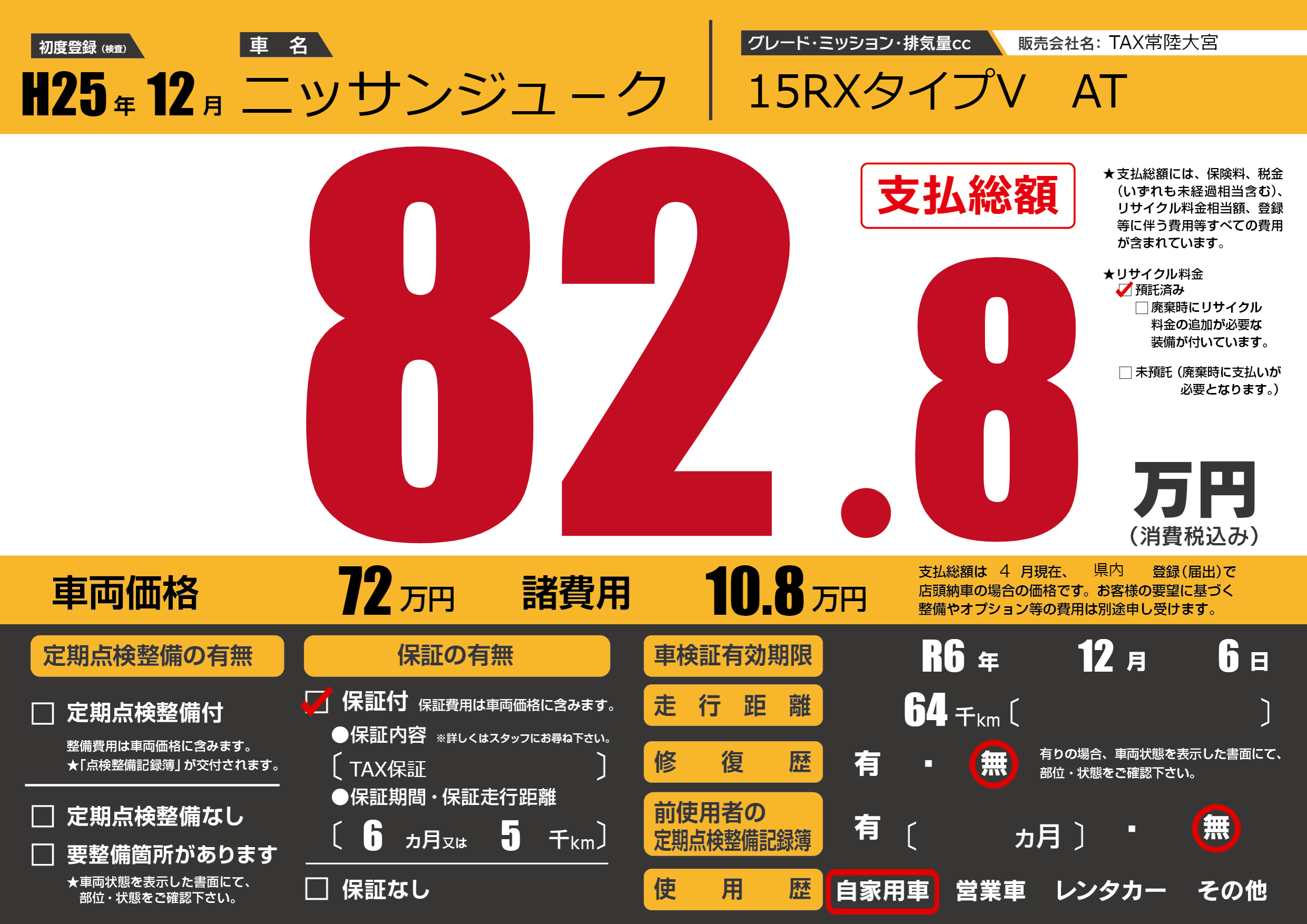 保証付き 保証内容(TAX保証) 6ヶ月または(5)千kmまで |