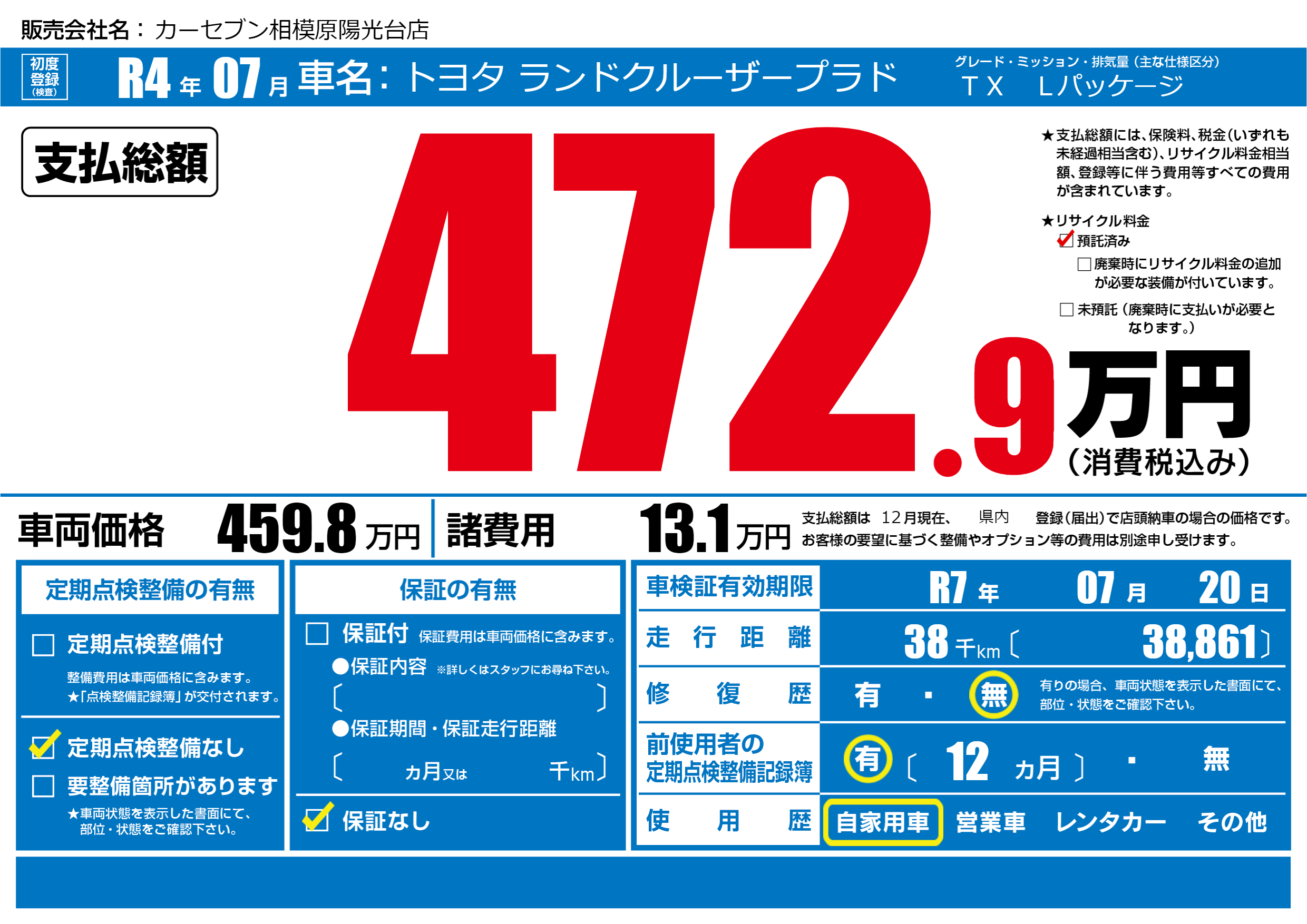 | 車名 | トヨタ ランドクルーザープラド | グレード ミッション 排気量 |