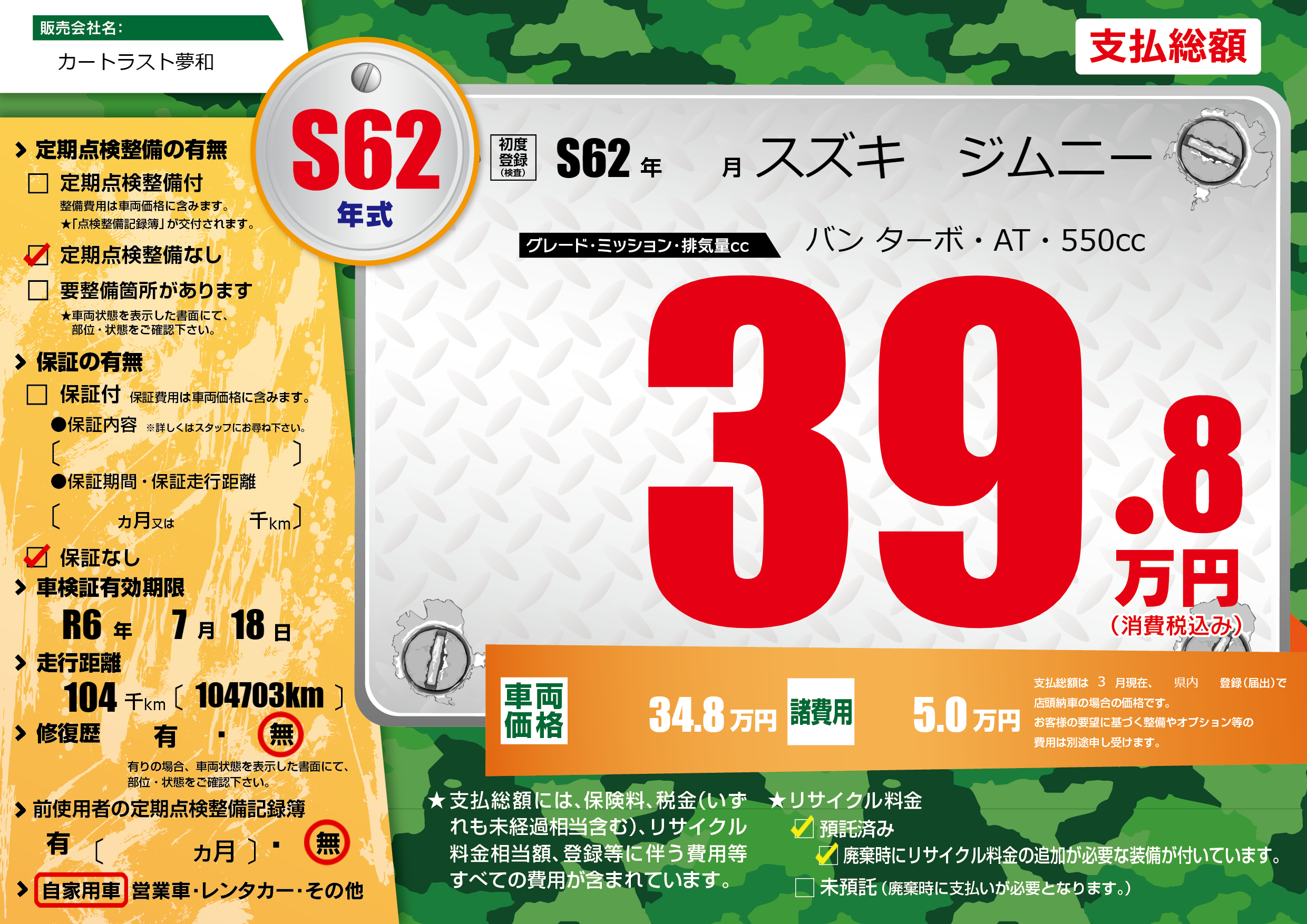 | 走行キロ | 10.4万km | 初年度登録 | S62年---月 |