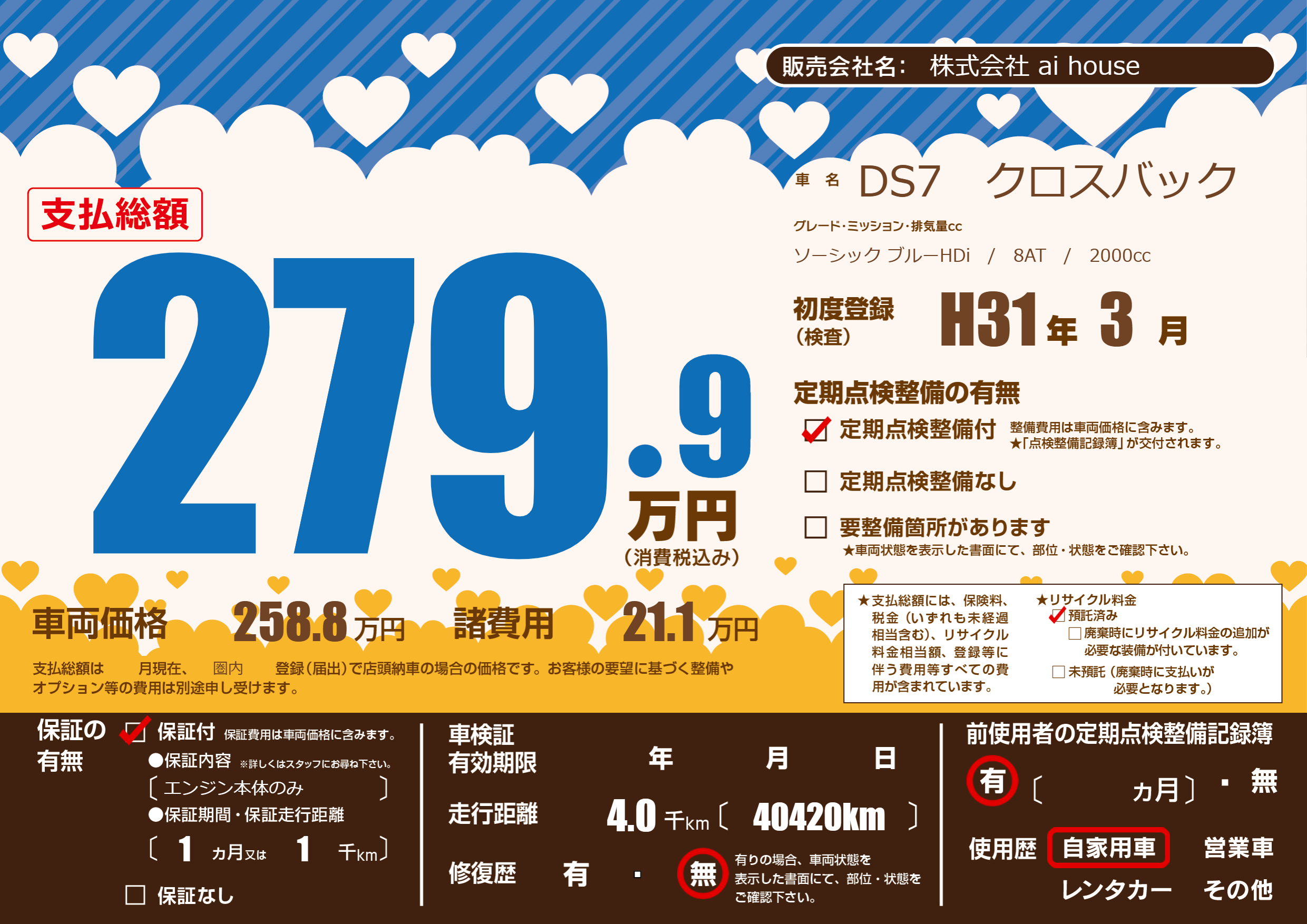 | 車名 | DS7 クロスバック | グレード ミッション 排気量 |