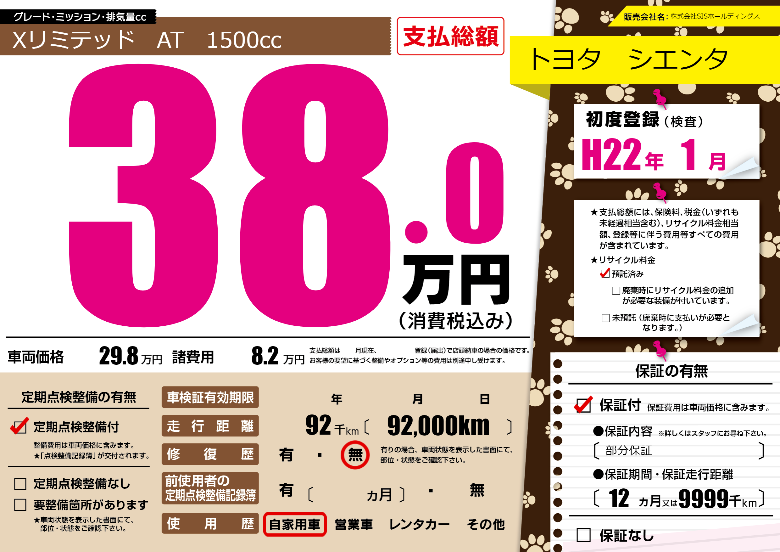 | 車名 | トヨタ シエンタ | グレード ミッション 排気量 |