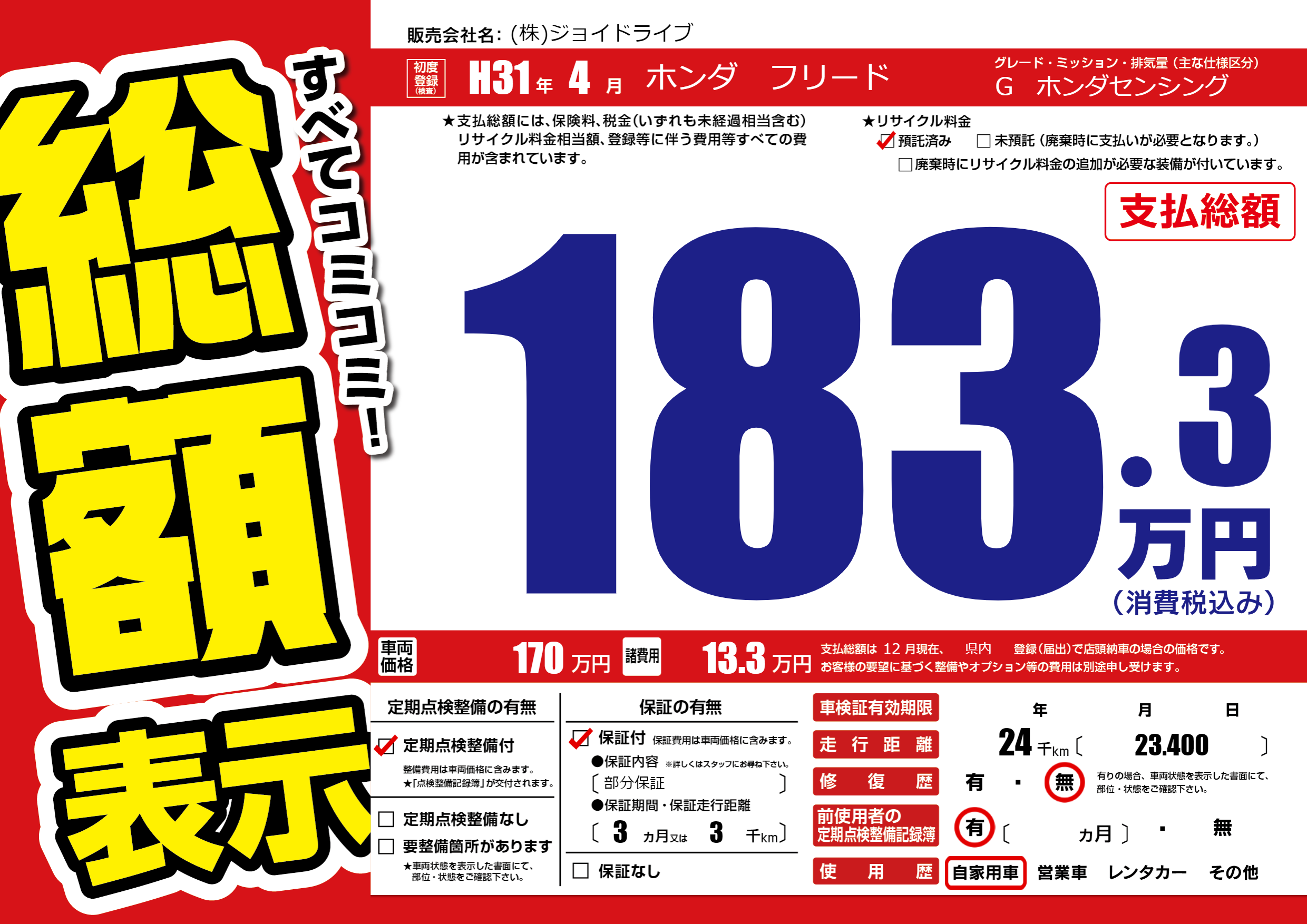 | 車名 | ホンダ フリード | グレード ミッション 排気量 |