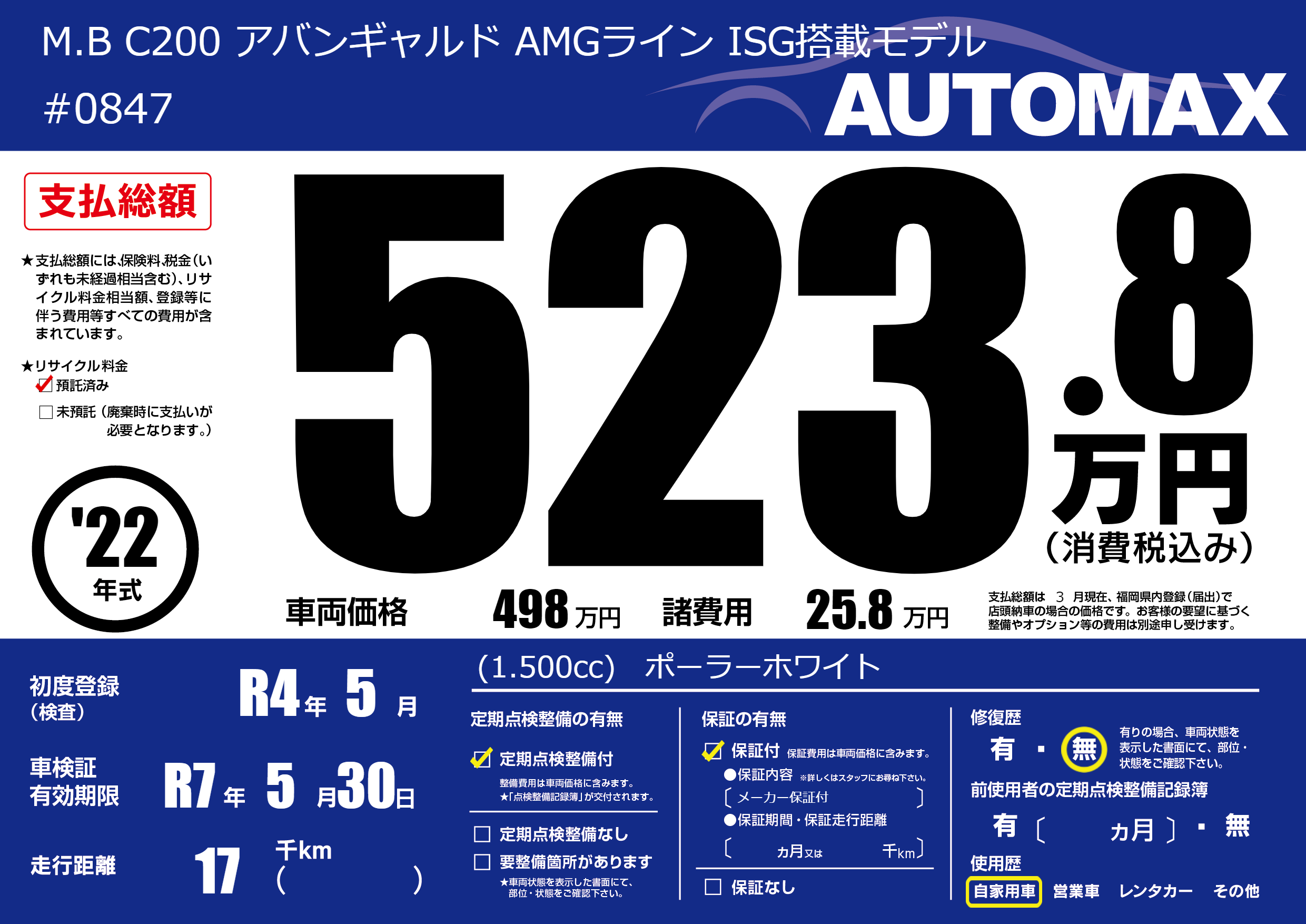 | 車名 | M.B C200 アバンギャルド AMGライン ISG搭載モデル | グレード ミッション 排気量 |
