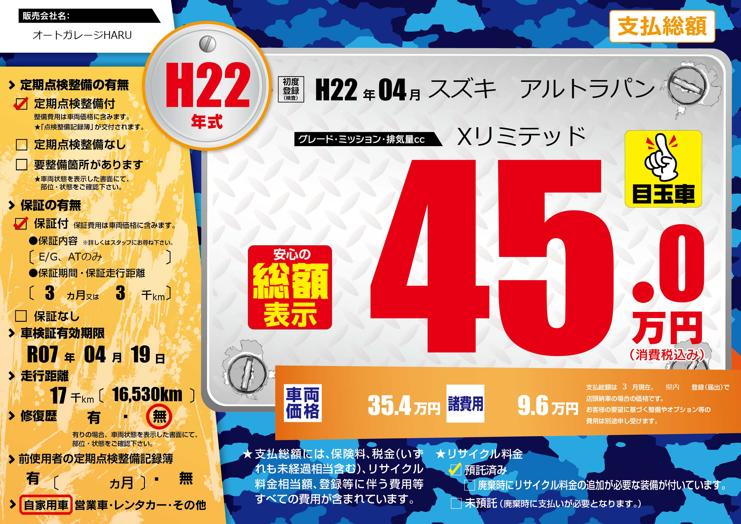 | 走行キロ | 1.7万km | 初年度登録 | H22年04月 |