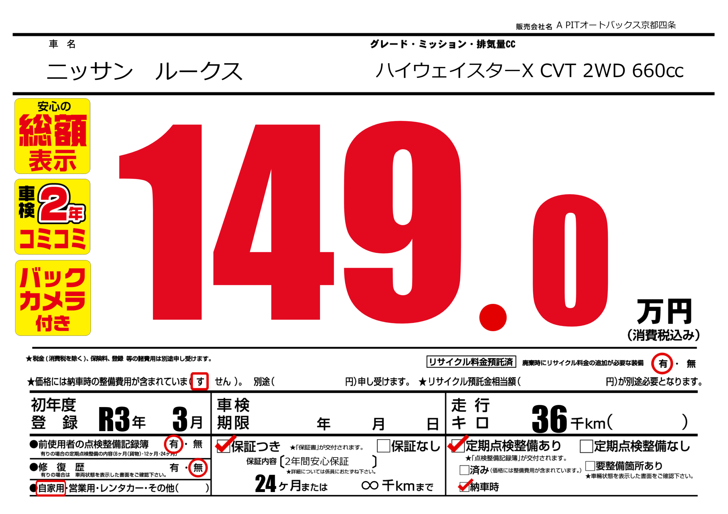 | 走行キロ | 3.6万km | 初年度登録 | R3年3月 |