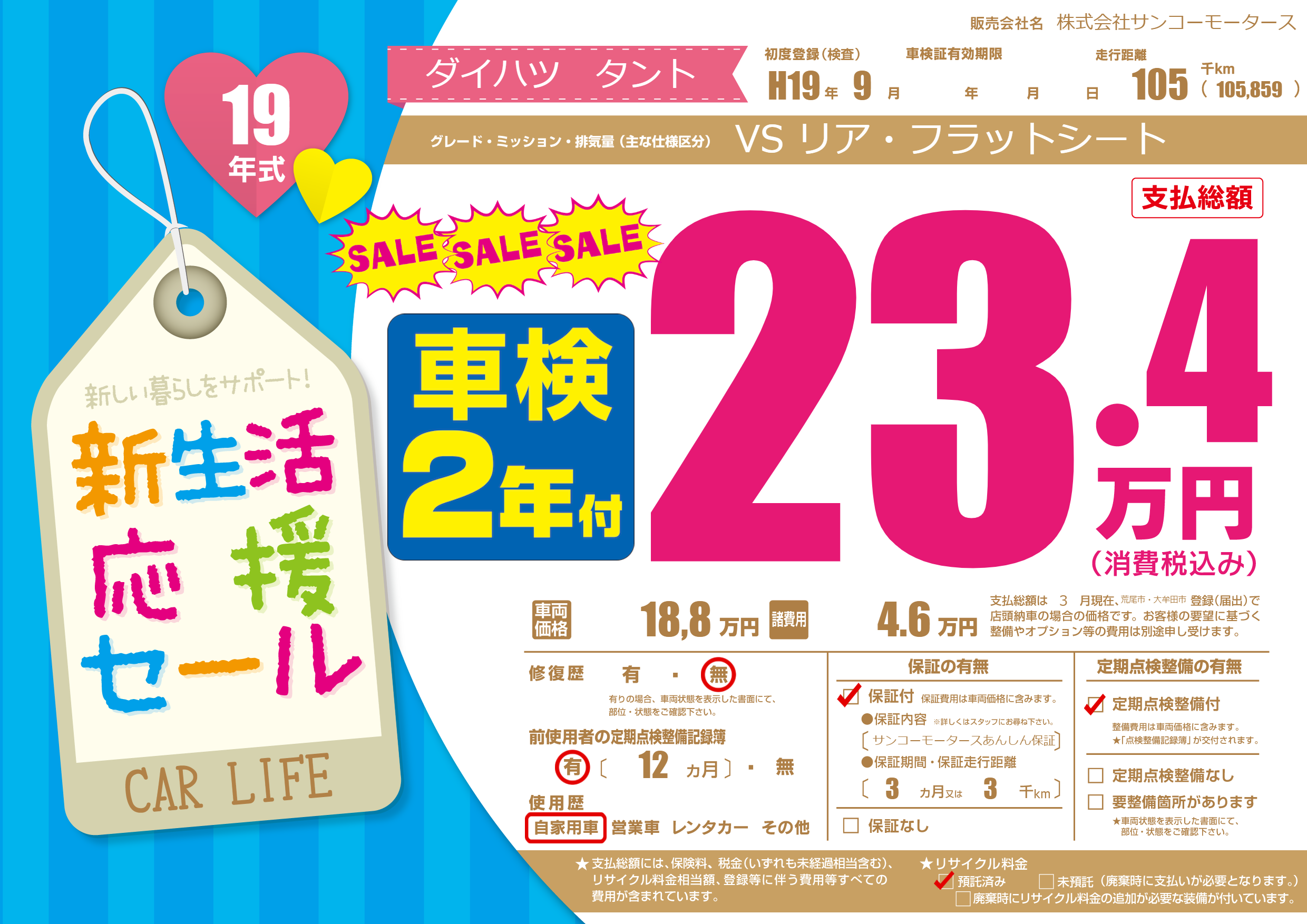 | 車名 | ダイハツ タント | グレード ミッション 排気量 |