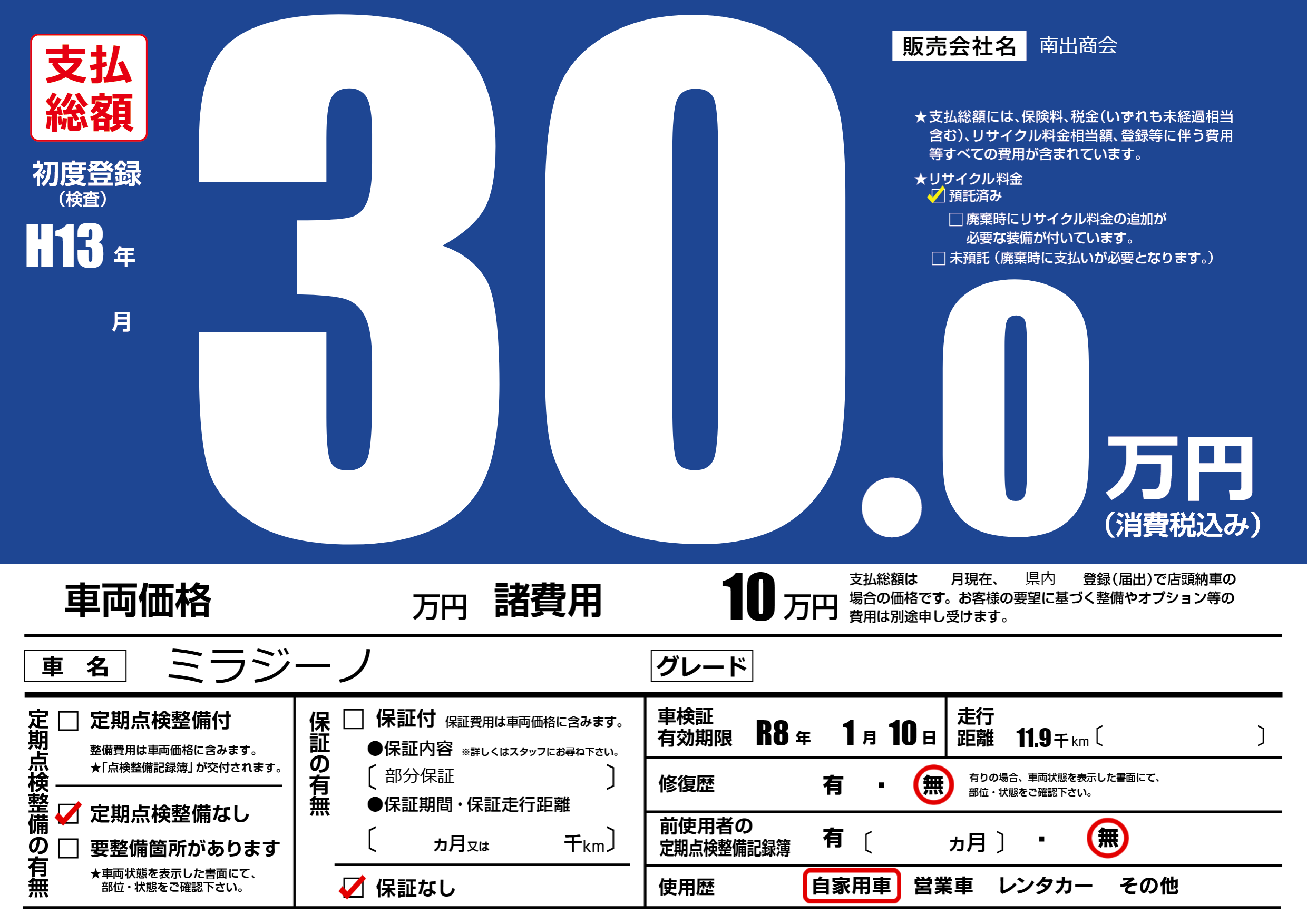 保証なし 保証内容(部分保証) ---ヶ月または()千kmまで |