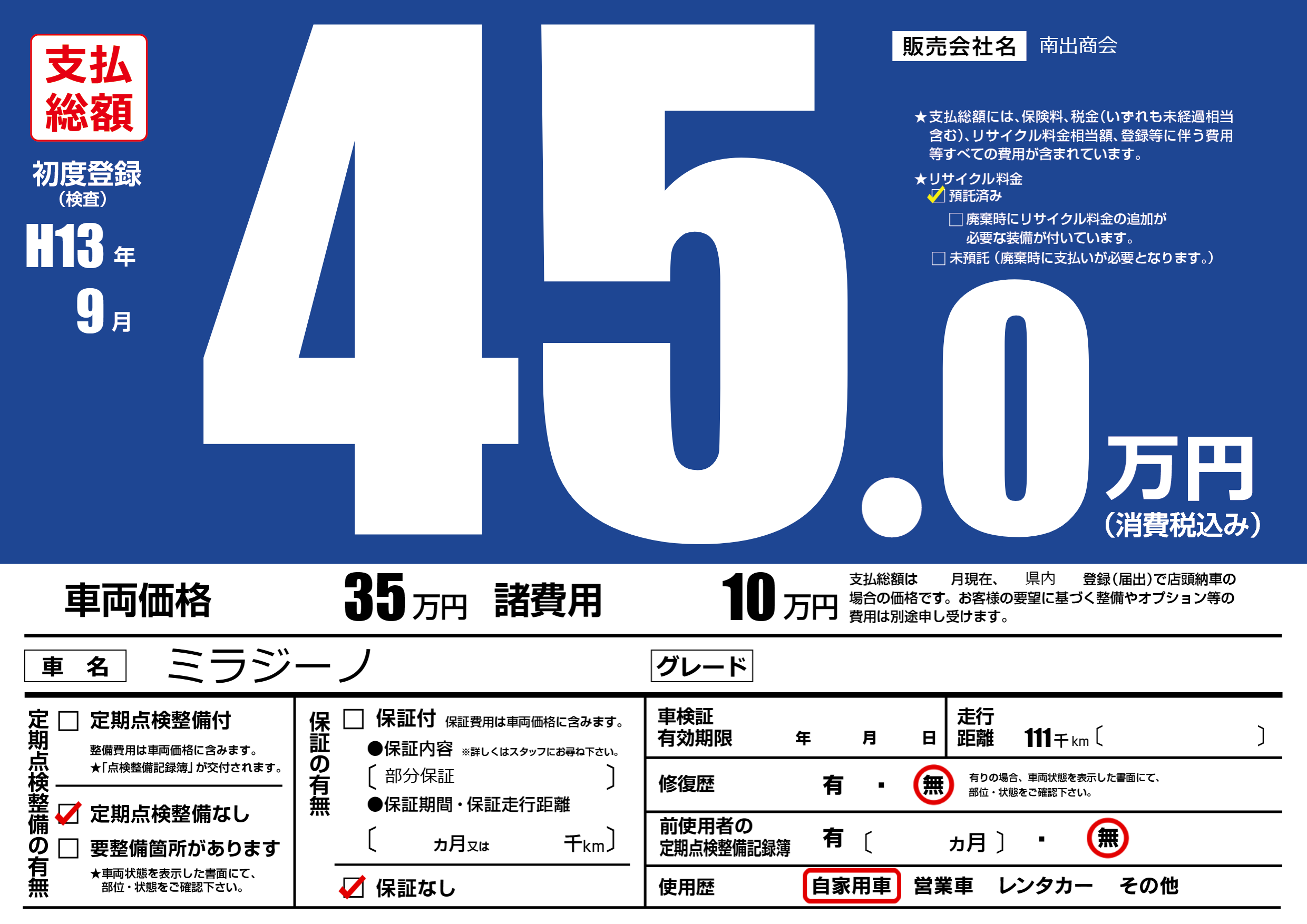 | 走行キロ | 11.1万km | 初年度登録 | H13年9月 |