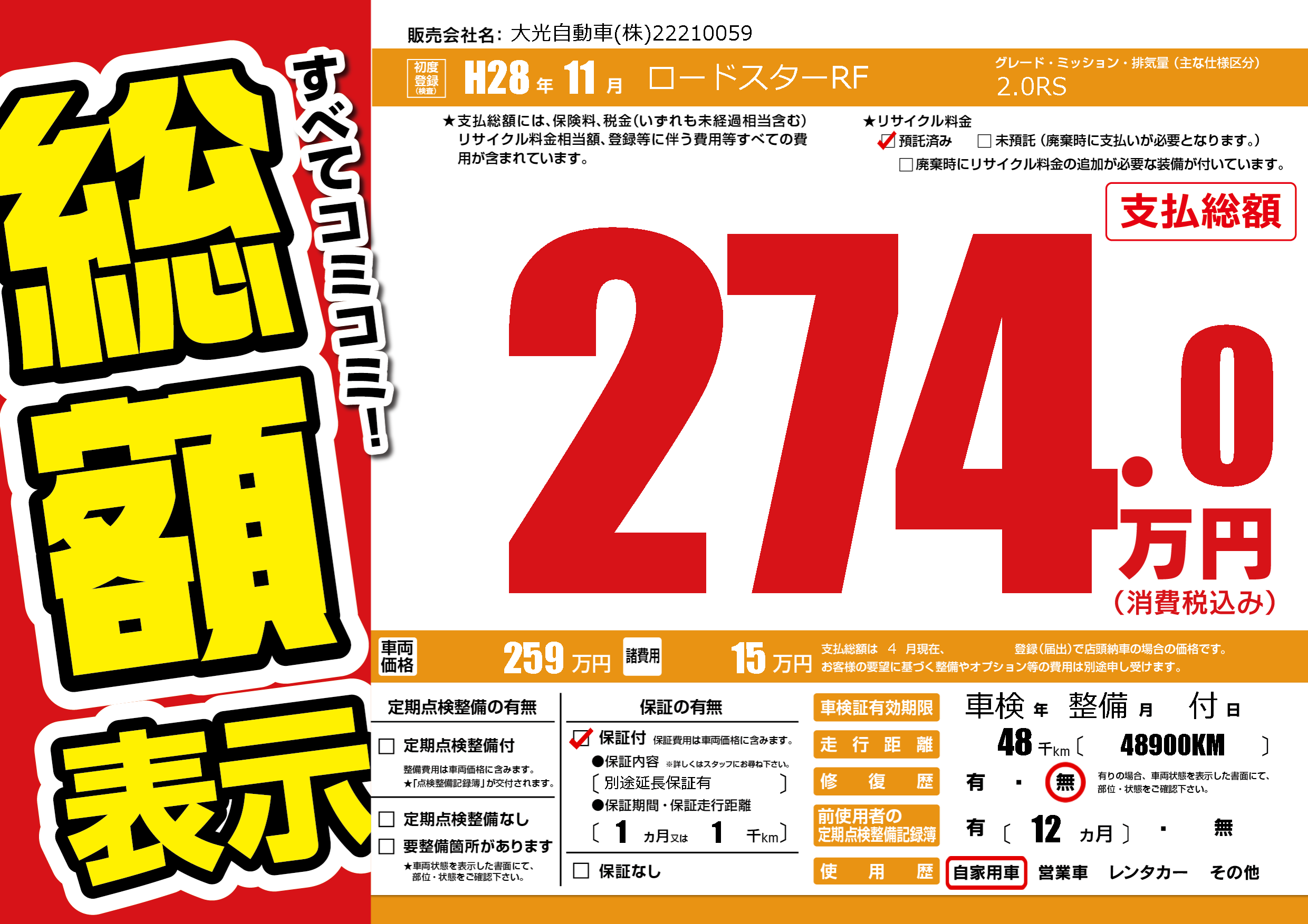 | 車名 | ロードスターRF | グレード ミッション 排気量 |
