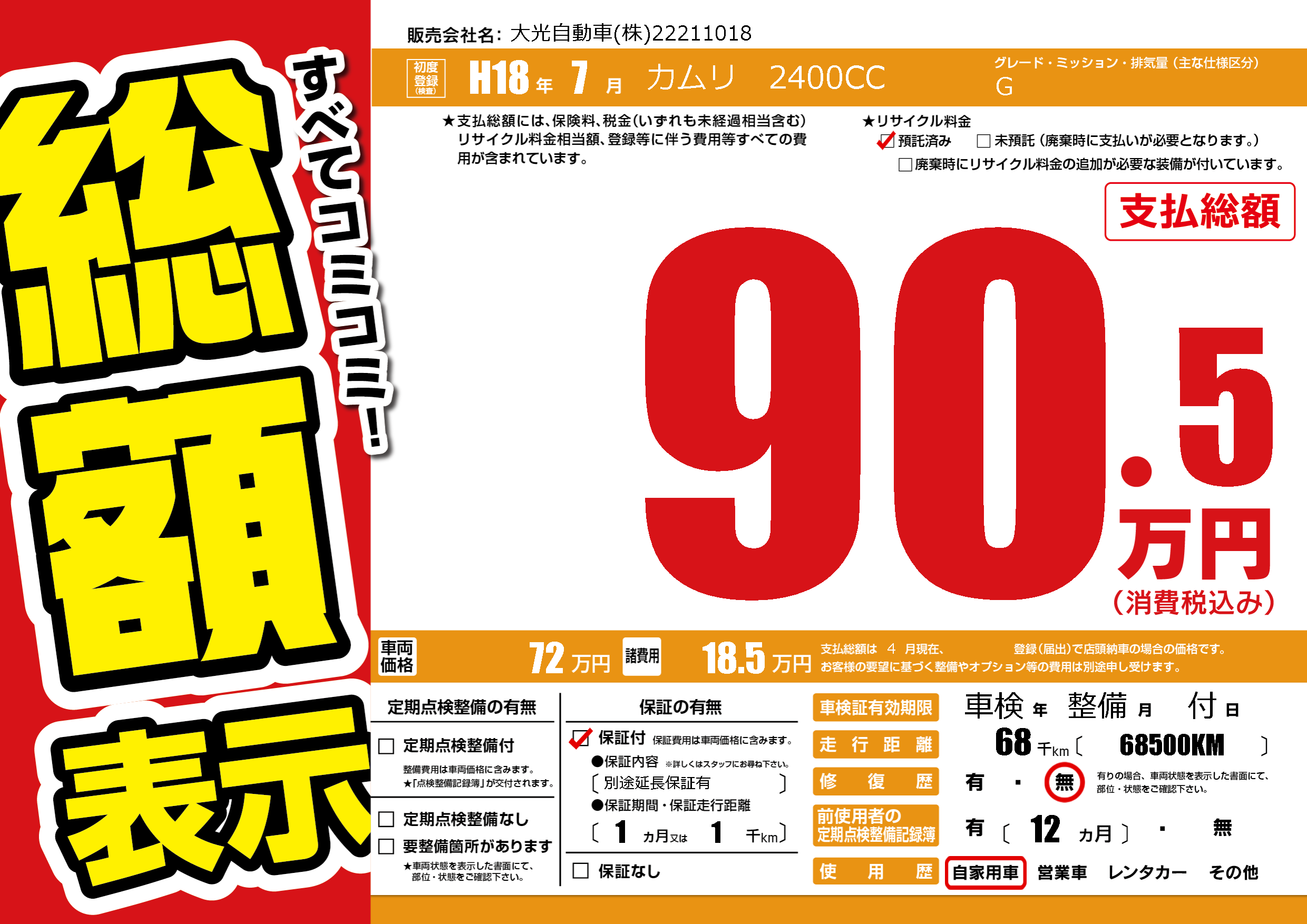 | 車名 | カムリ 2400CC | グレード ミッション 排気量 |
