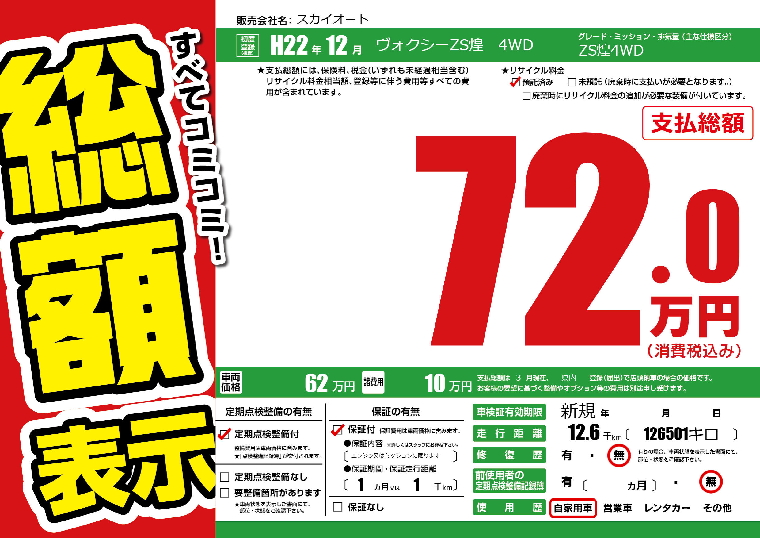 | 車名 | ヴォクシーZS煌 4WD | グレード ミッション 排気量 |