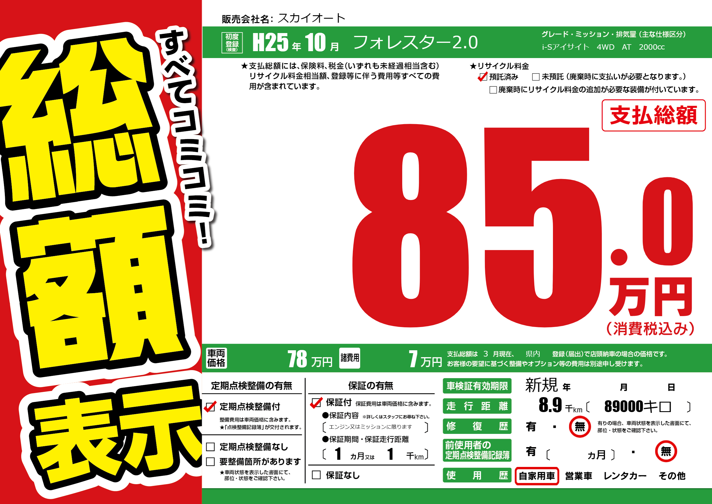 | 車名 | フォレスター2.0 | グレード ミッション 排気量 |