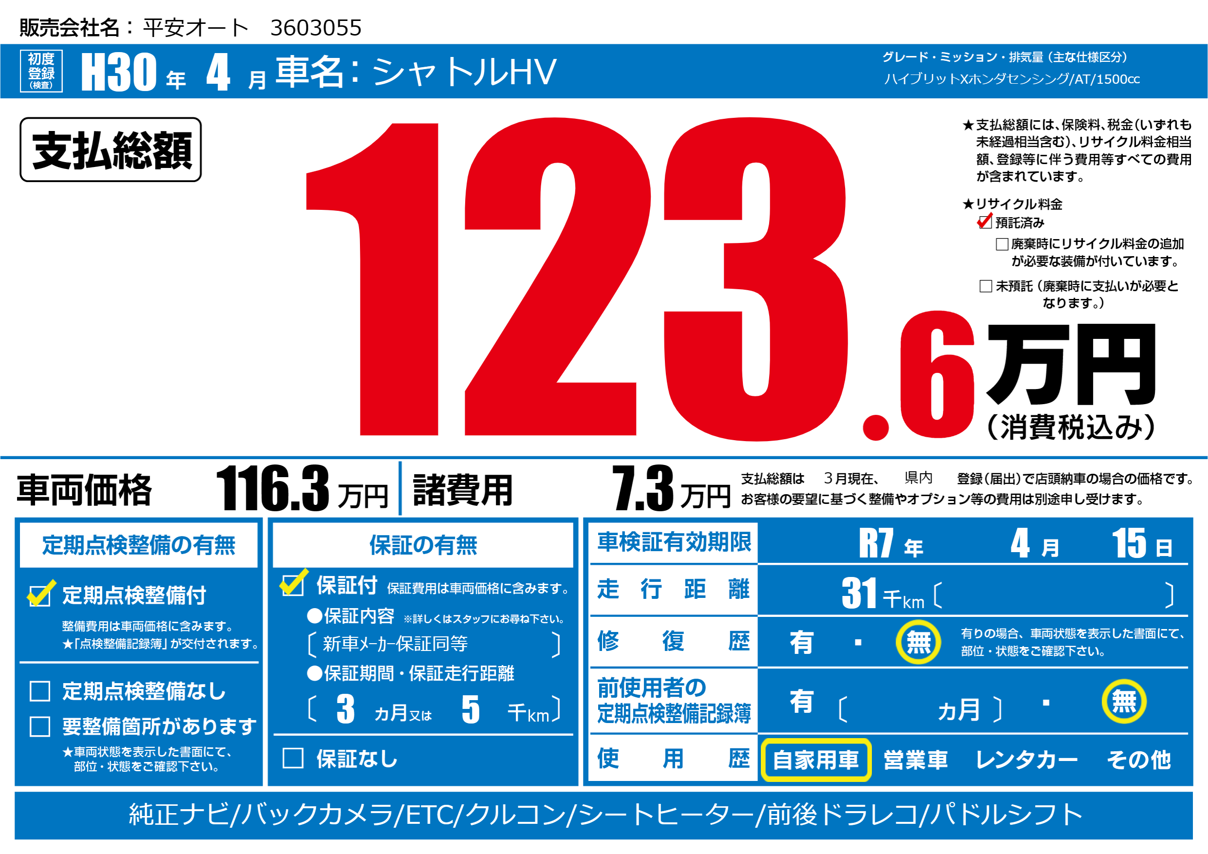 | 走行キロ | 3.1万km | 初年度登録 | H30年4月 |