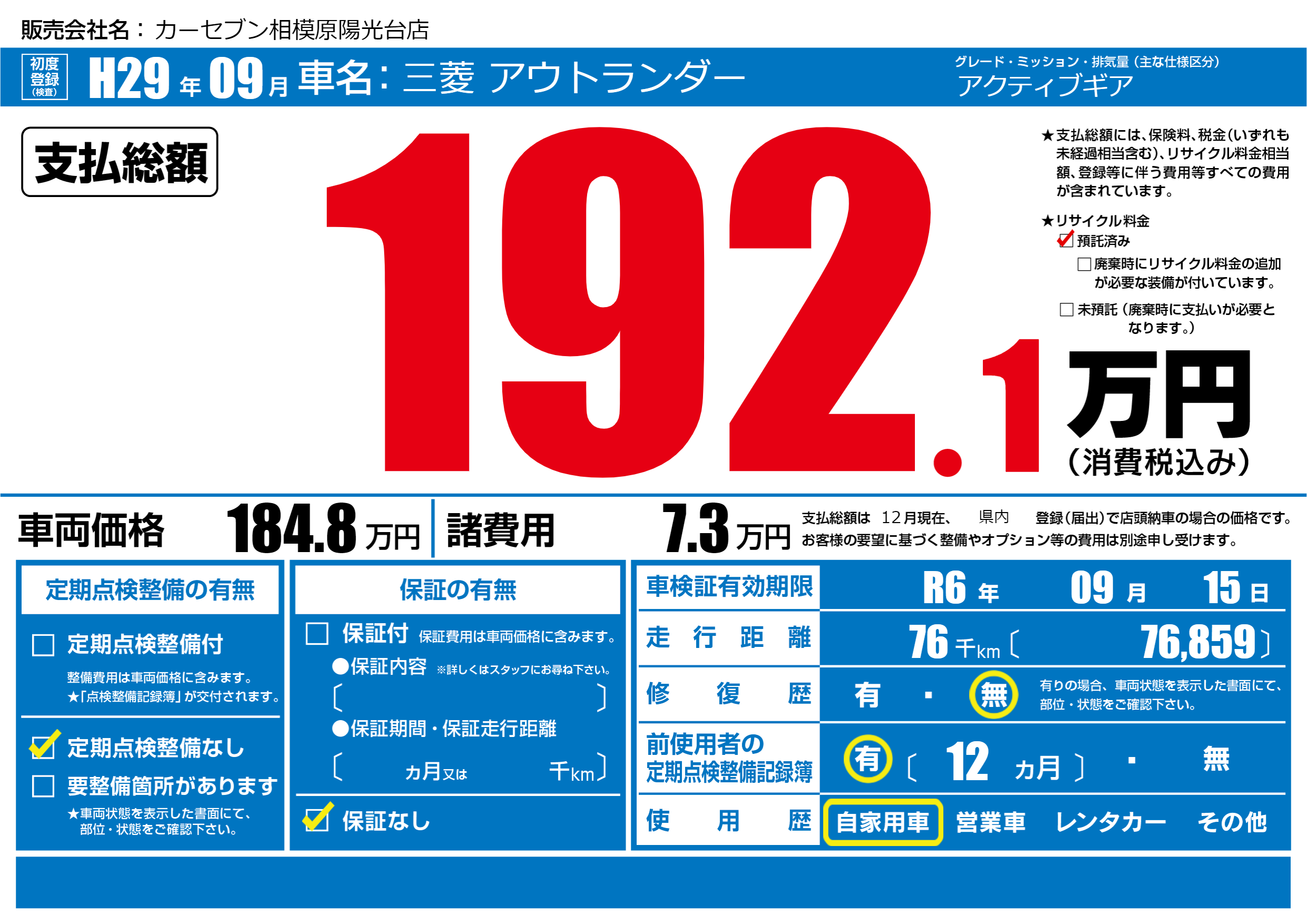 | 車検制限 | R6年 09月 15日 | ||