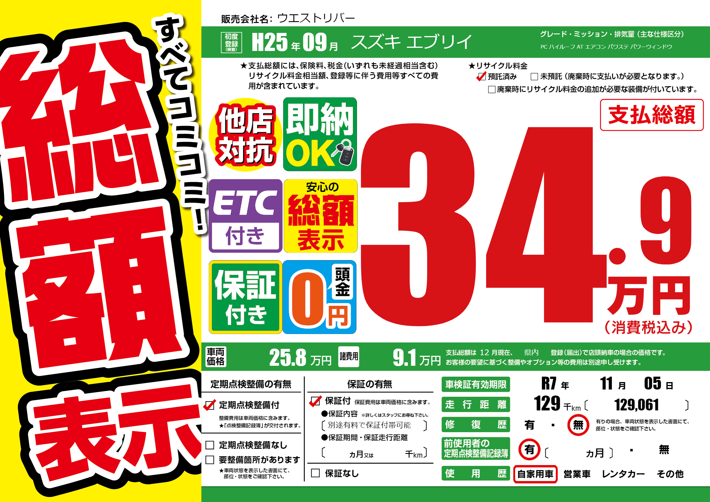 | 走行キロ | 12.9万km | 初年度登録 | H25年09月 |