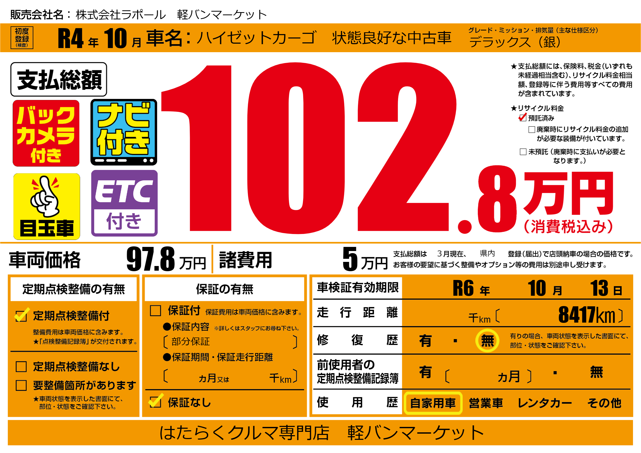 なし | 車検制限 | R6年10月13月 |