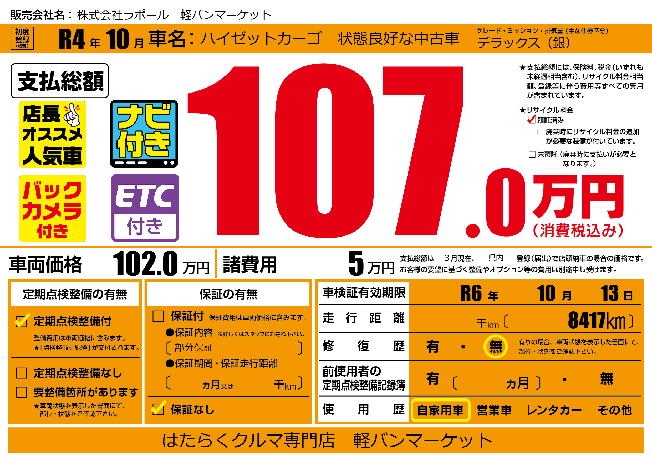 なし | 車検制限 | R6年10月13月 |