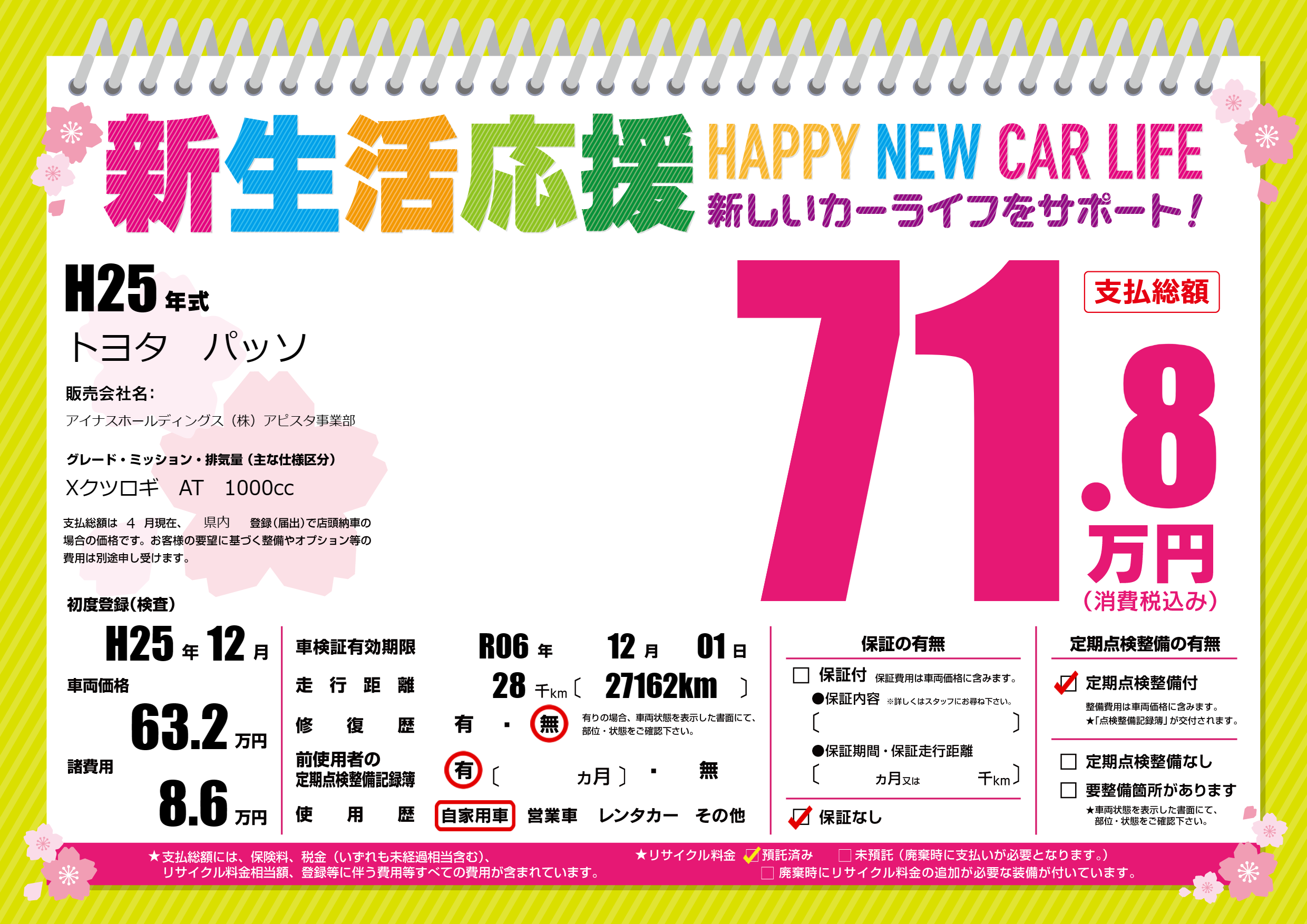 | 車名 | トヨタ パッソ | グレード ミッション 排気量 |
