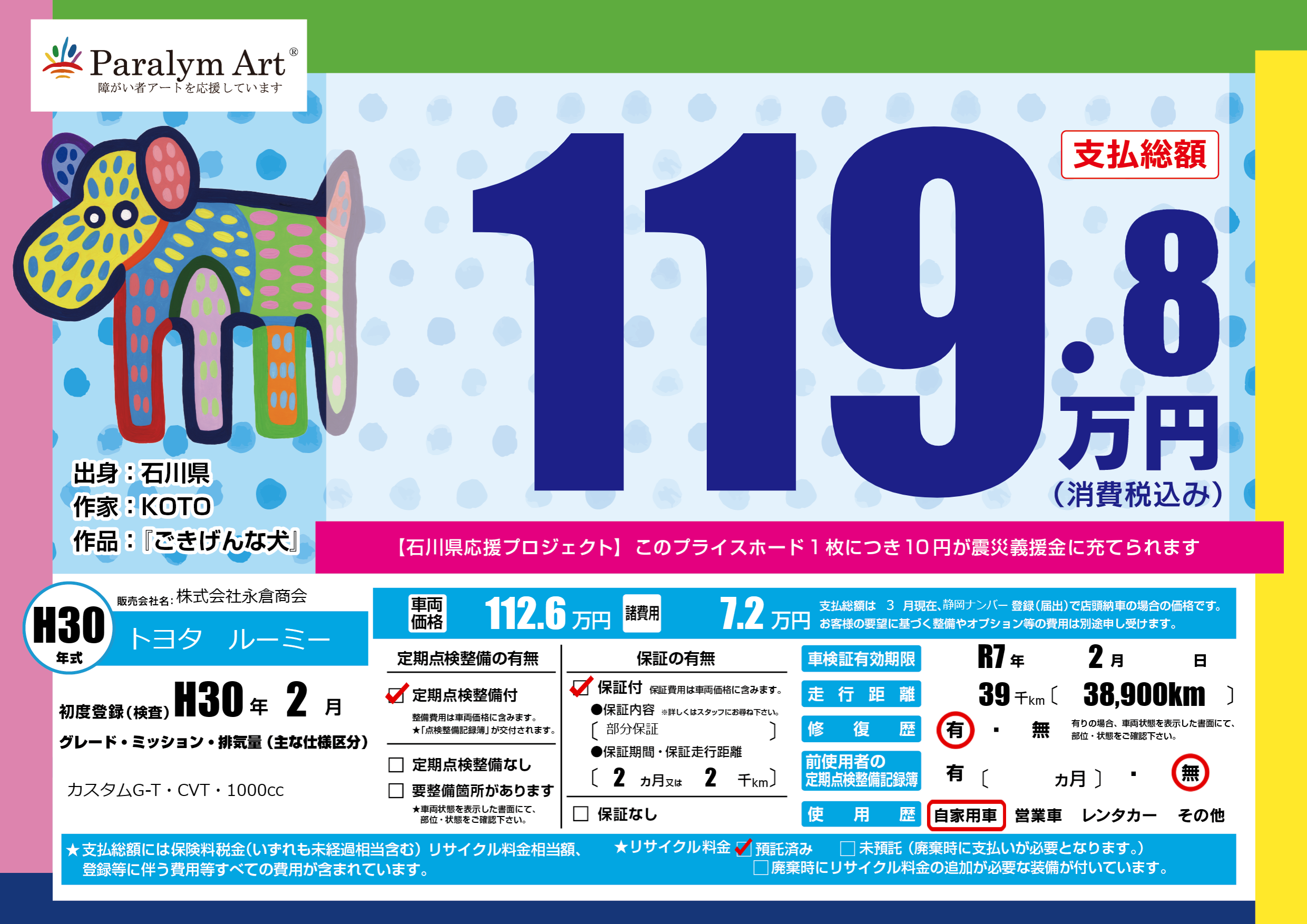 | 車名 | トヨタ ルーミー | グレード ミッション 排気量 |