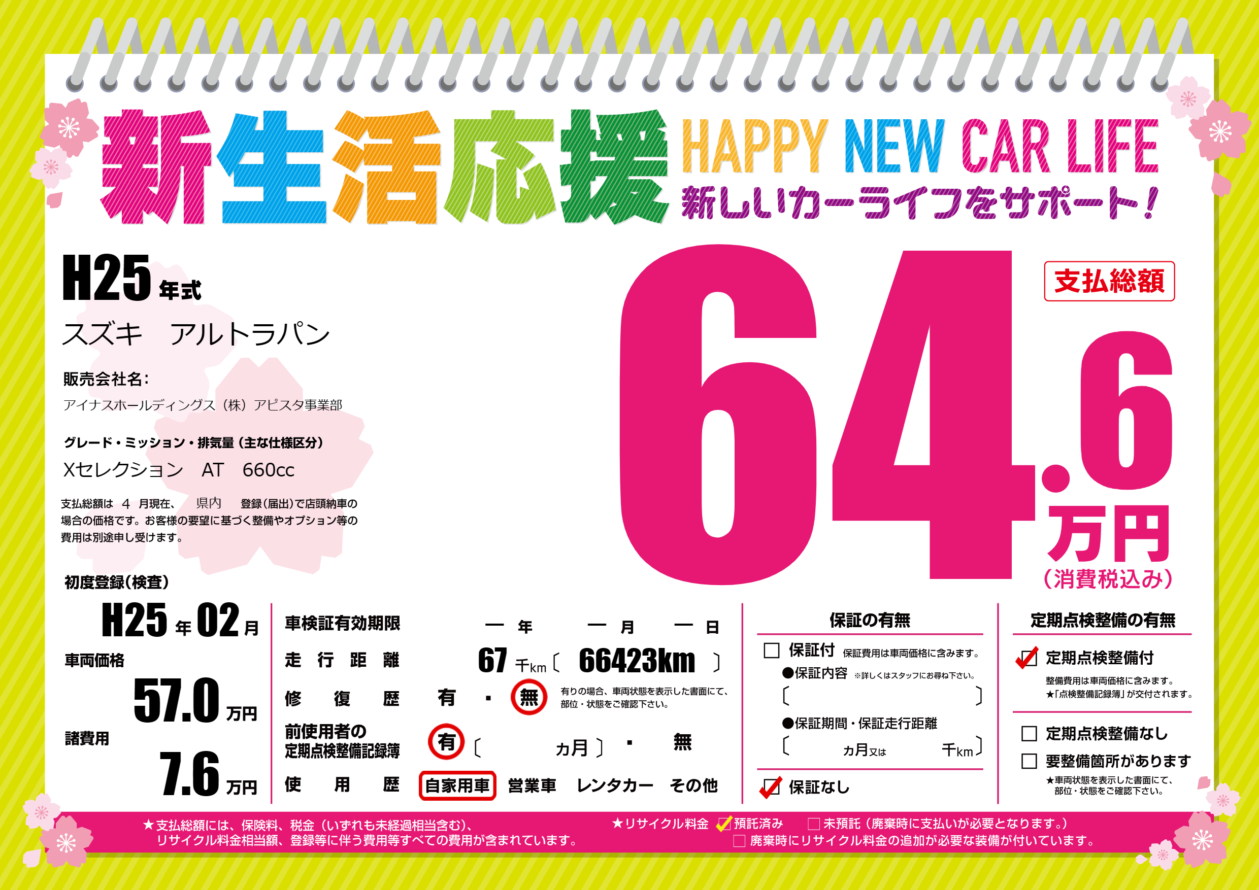 | 走行キロ | 6.7万km | 初年度登録 | H25年02月 |