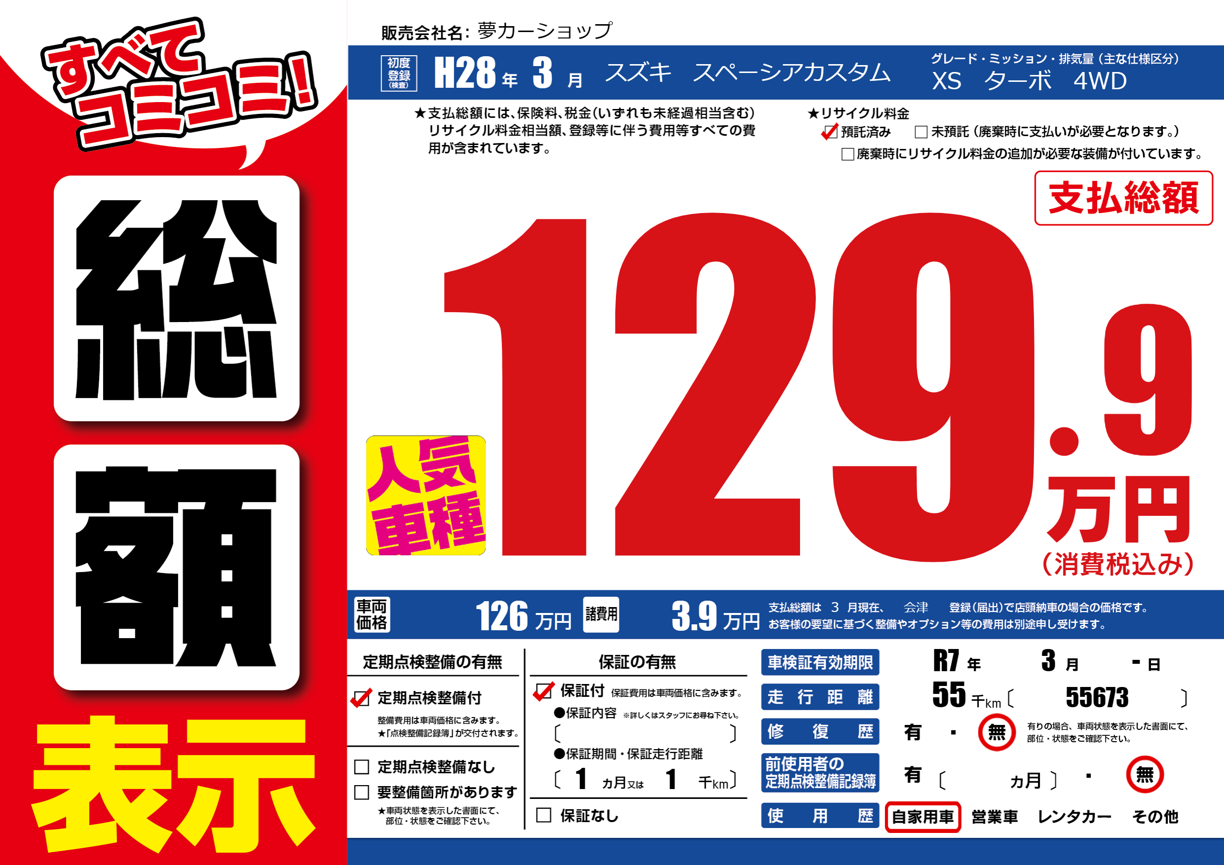 | 走行キロ | 5.5万km | 初年度登録 | H28年3月 |