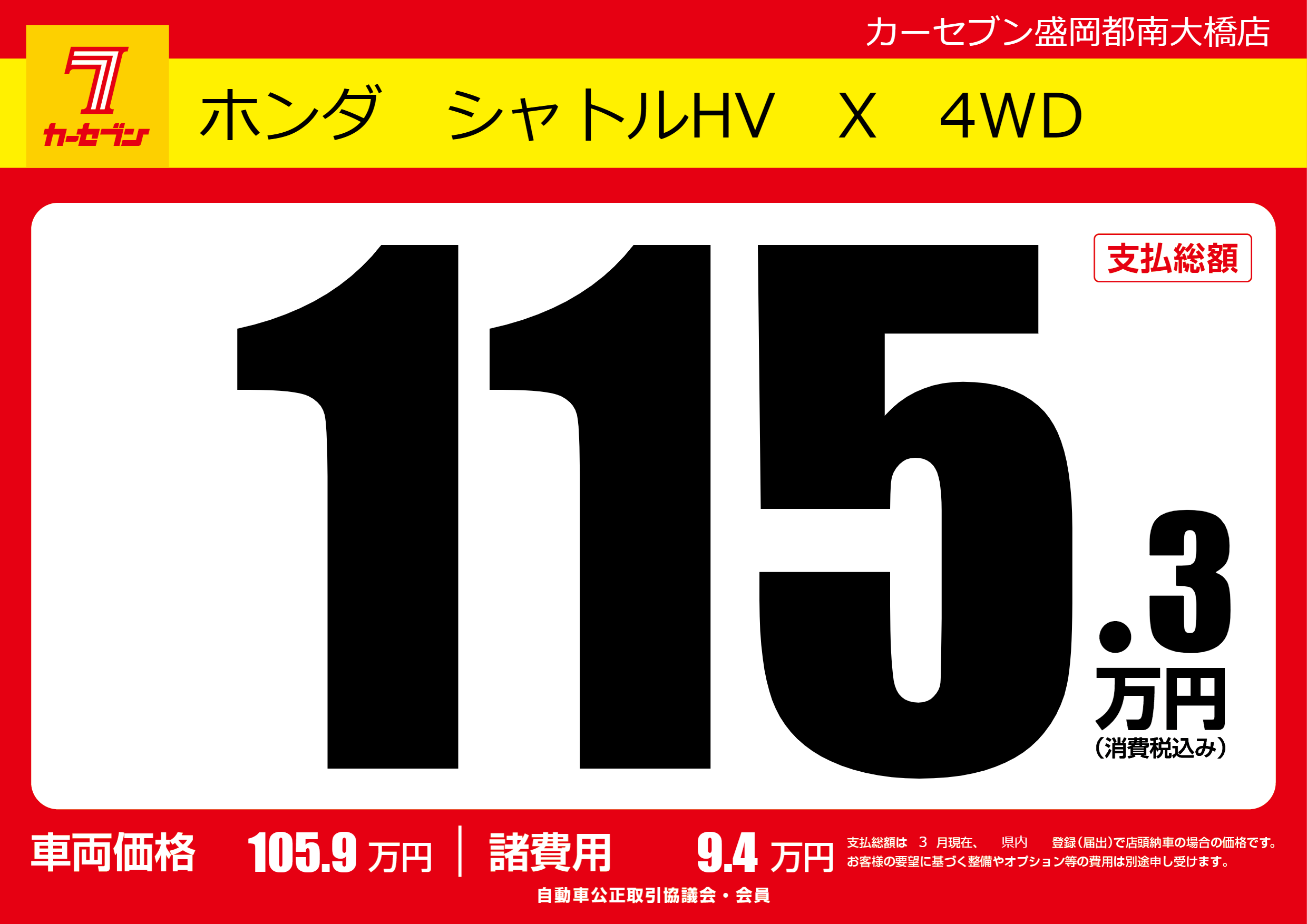 | 車名 | ホンダ シャトルHV X 4WD | グレード ミッション 排気量 |