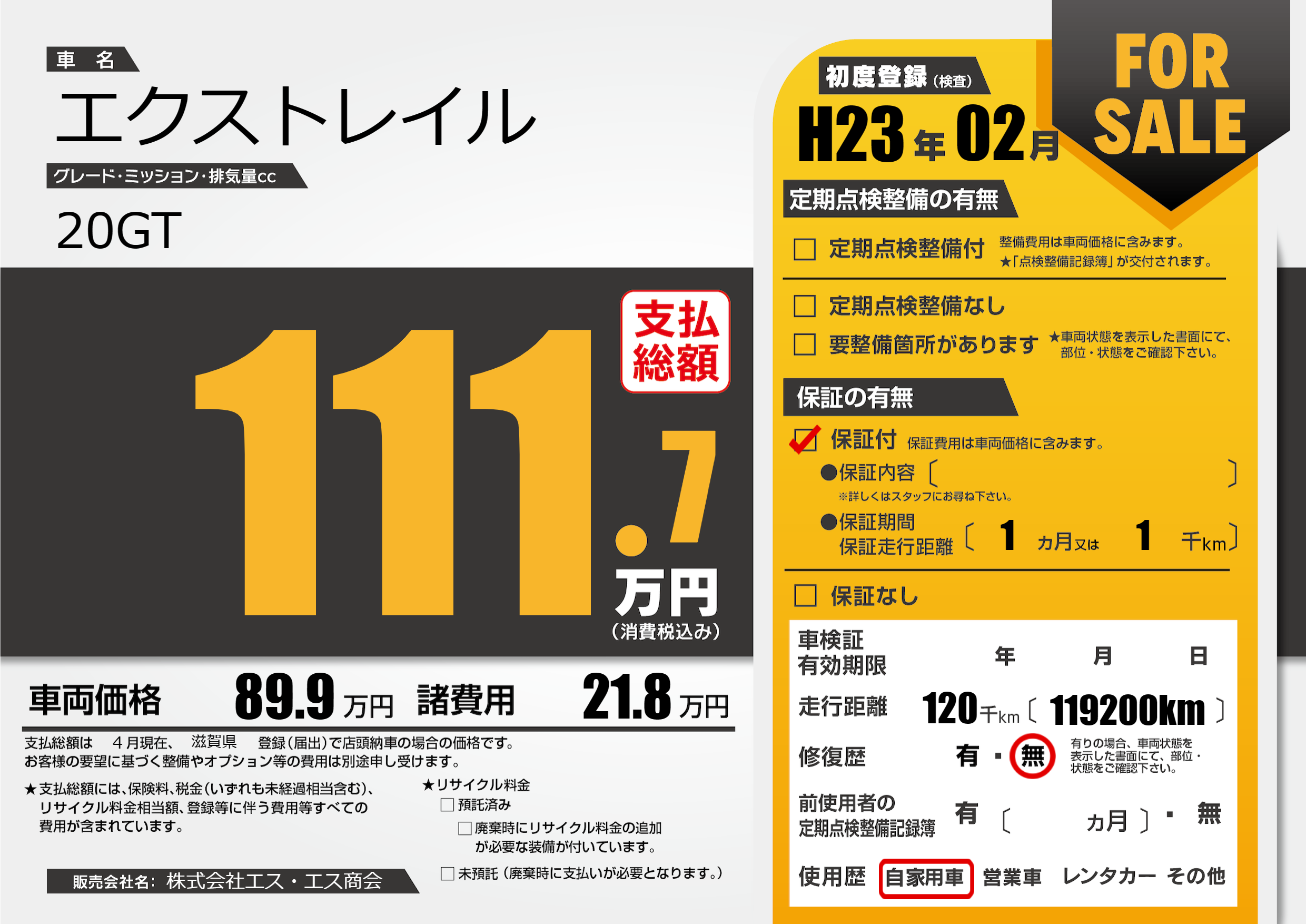 | 車名 | エクストレイル | グレード ミッション 排気量 |