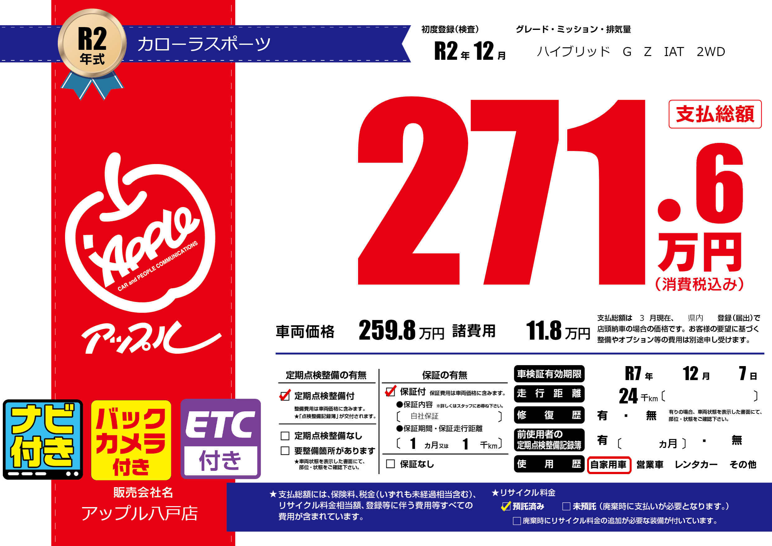 | 車名 | カローラスポーツ | グレード ミッション 排気量 |