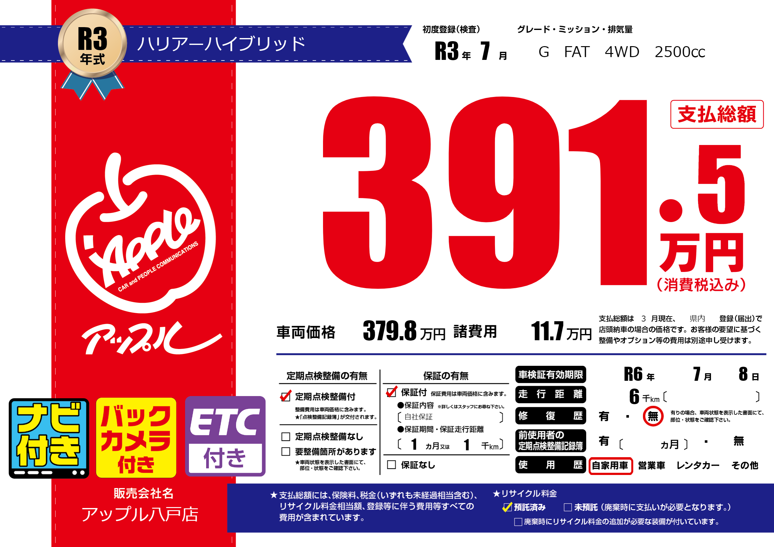 | 走行キロ | 0.6万km | 初年度登録 | R3年7月 |